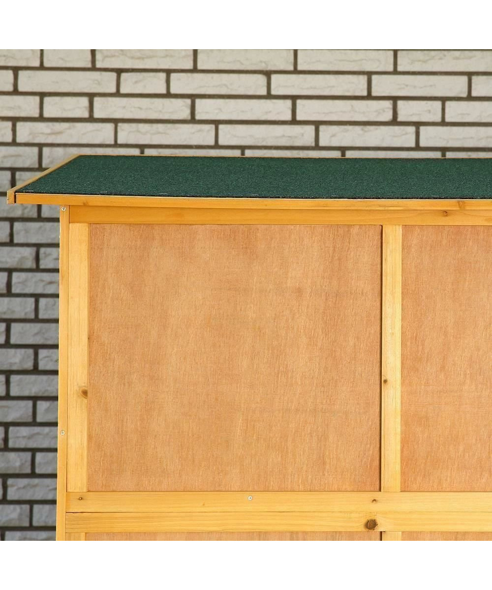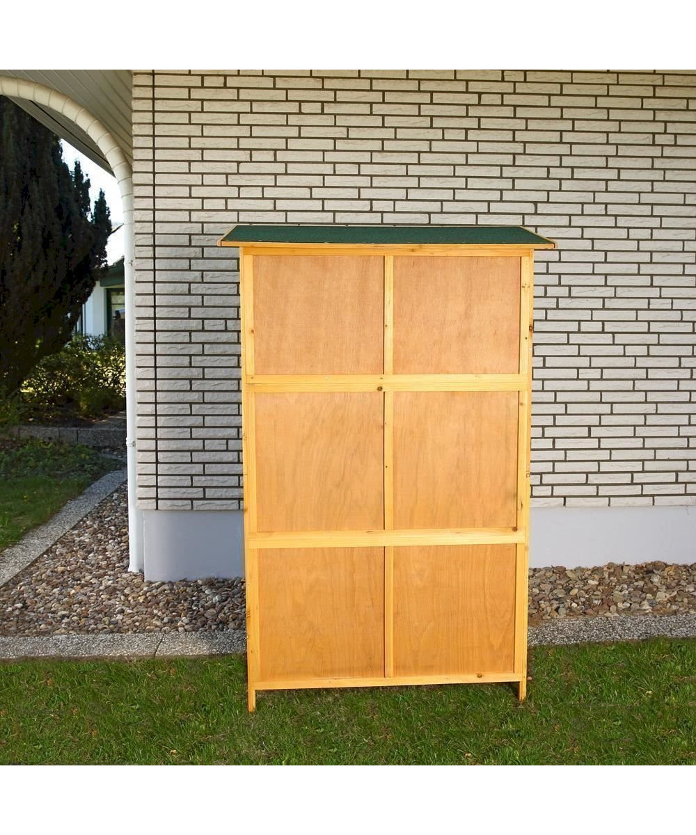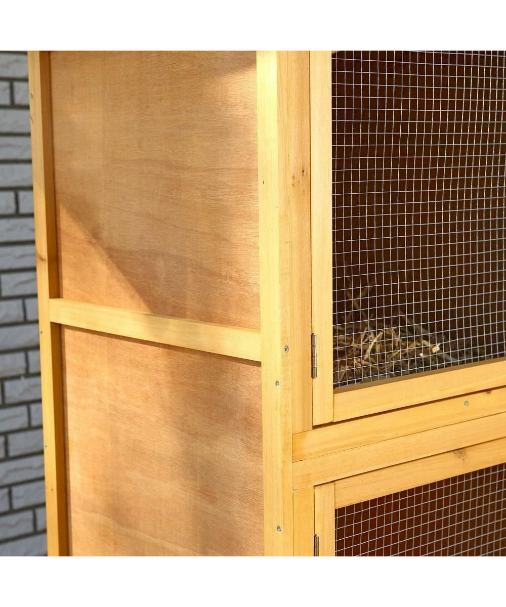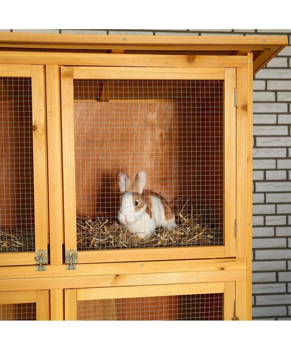 Il est harmonieusement conçu et équipé d'extras tels que des charnières en acier inoxydable. L'étable offre suffisamment d'espace pour les animaux. Les boîtes individuelles sont faciles à nettoyer et permettent ainsi un élevage hygiénique. Afin de réduire le risque de blessure, l'espacement des grilles est réglé de manière à ce que les lapins ne puissent pas passer le nez à travers les grilles. Le modèle a un toit déjà couvert et est fait de bois.