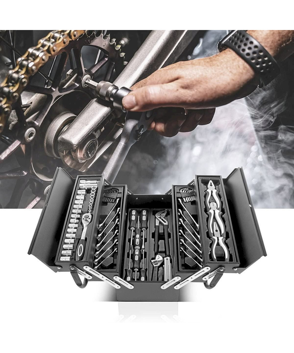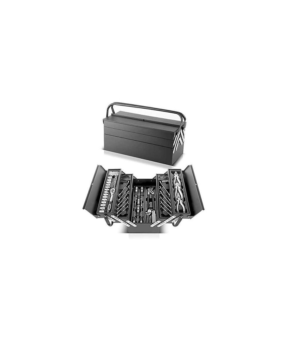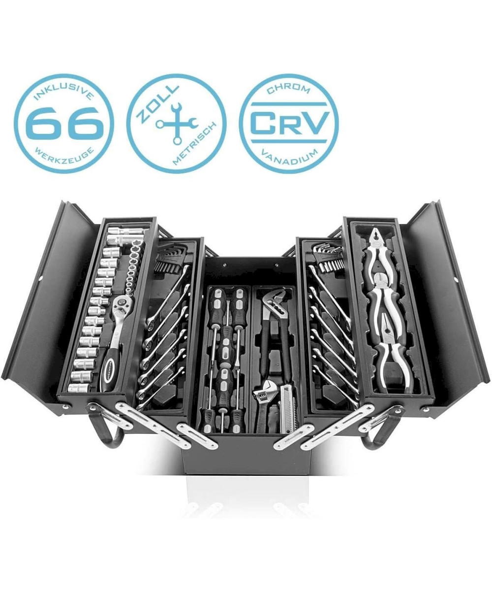 - Coffre à outils revêtu par poudre, équipé de 66 outils professionnels en chrome-vanadium de haute qualité.