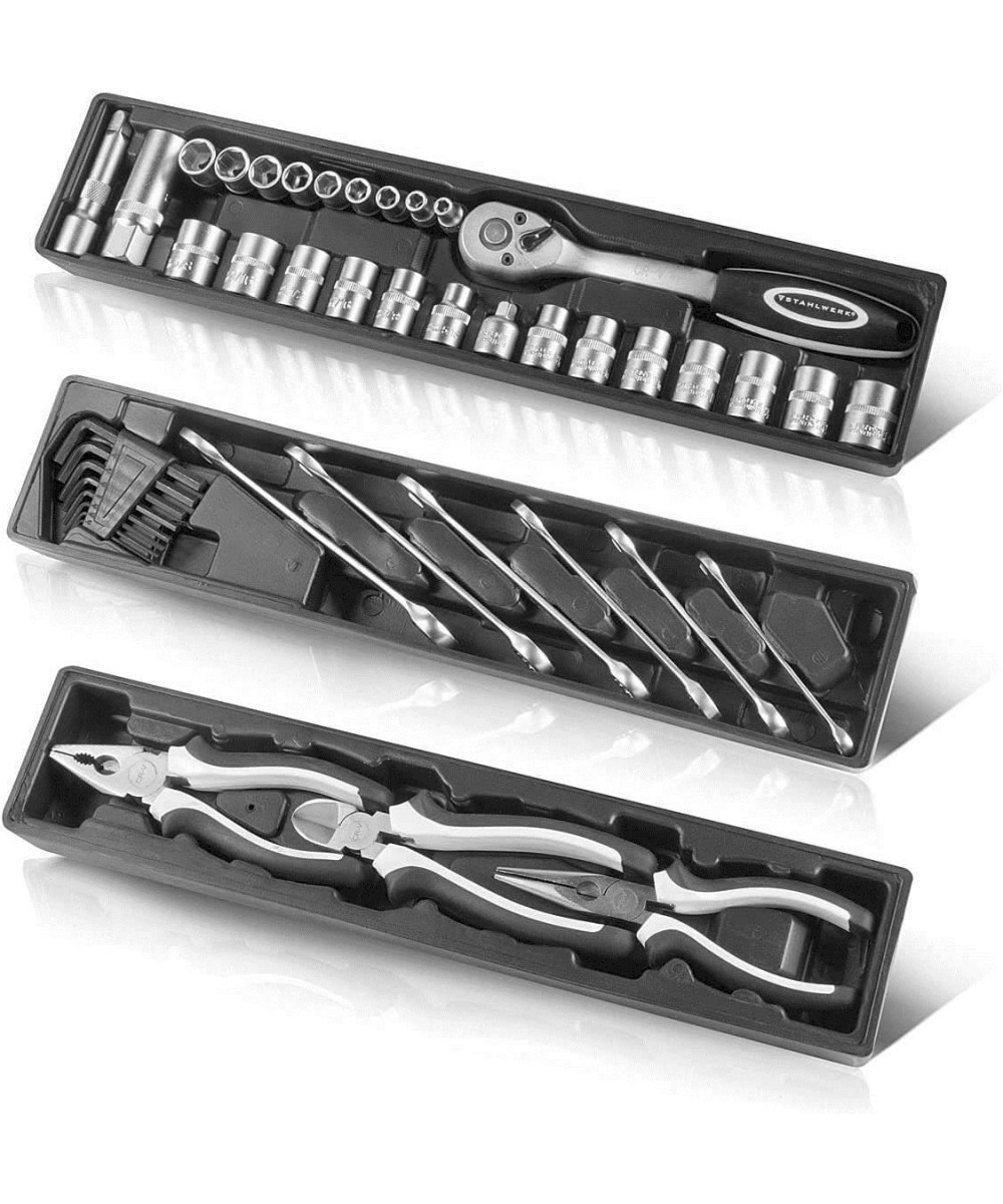 - Les outils sont répartis de manière claire et bien ordonnée dans 5 compartiments avec 6 inserts en plastique ABS.