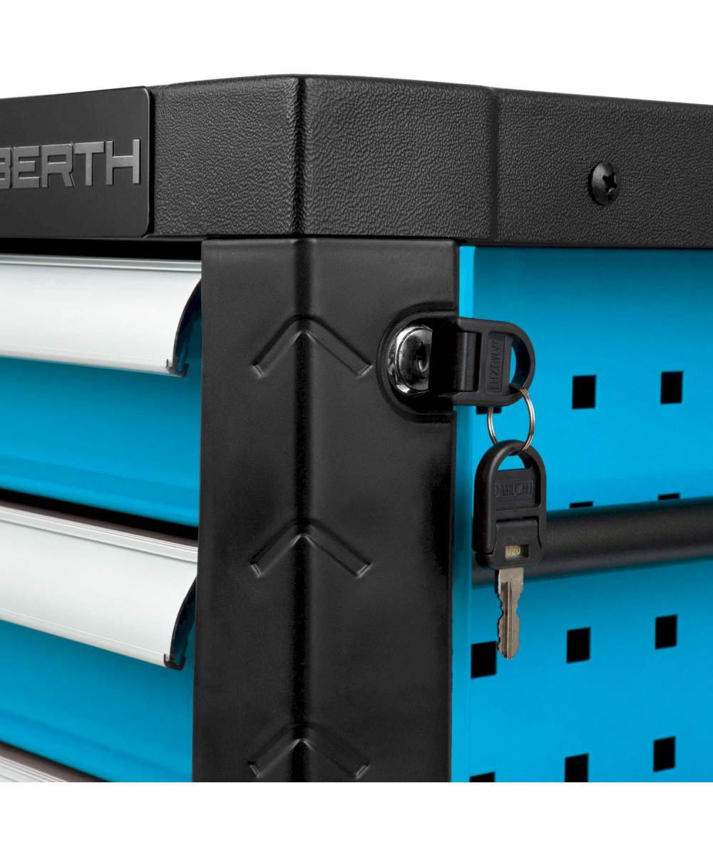 Les 4 tiroirs sont équipés de glissières télescopiques à roulements à billes qui s'enclenchent lorsqu'elles sont fermées et protègent ainsi contre toute ouverture involontaire. Un cadenas permet de verrouiller le chariot à outils et de protéger vos outils contre tout accès non autorisé.