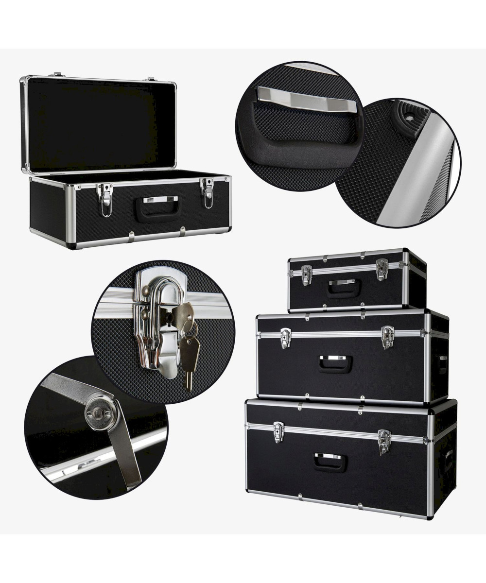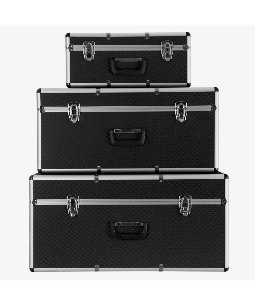 Les mallettes en aluminium plus petites s'adaptent aux mallettes plus grandes et, par conséquent, peuvent être stockées avec peu d'espace lorsqu'elles ne sont pas utilisées. Les bords sont renforcés d'aluminium lisse et les coins sont renforcés de plastique rigide. Les charnières métalliques sont rivetées au cadre et se caractérisent donc par une grande durabilité. Toutes les mallettes peuvent être verrouillées; les clés sont incluses dans l’emballage.