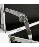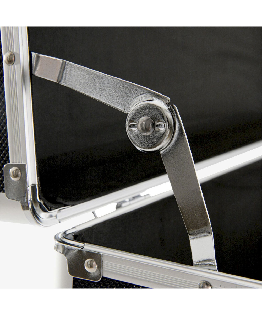Les bords de la mallette en aluminium sont encadrés d'aluminium lisse. De plus, la mallette présente des bords en aluminium renforcés et des coins résistants aux chocs. Les charnières sont fermement rivetées au cadre et présentent donc une grande durabilité. Lorsque les charnières sont entièrement déployées, le couvercle reste ouvert à 90°. -