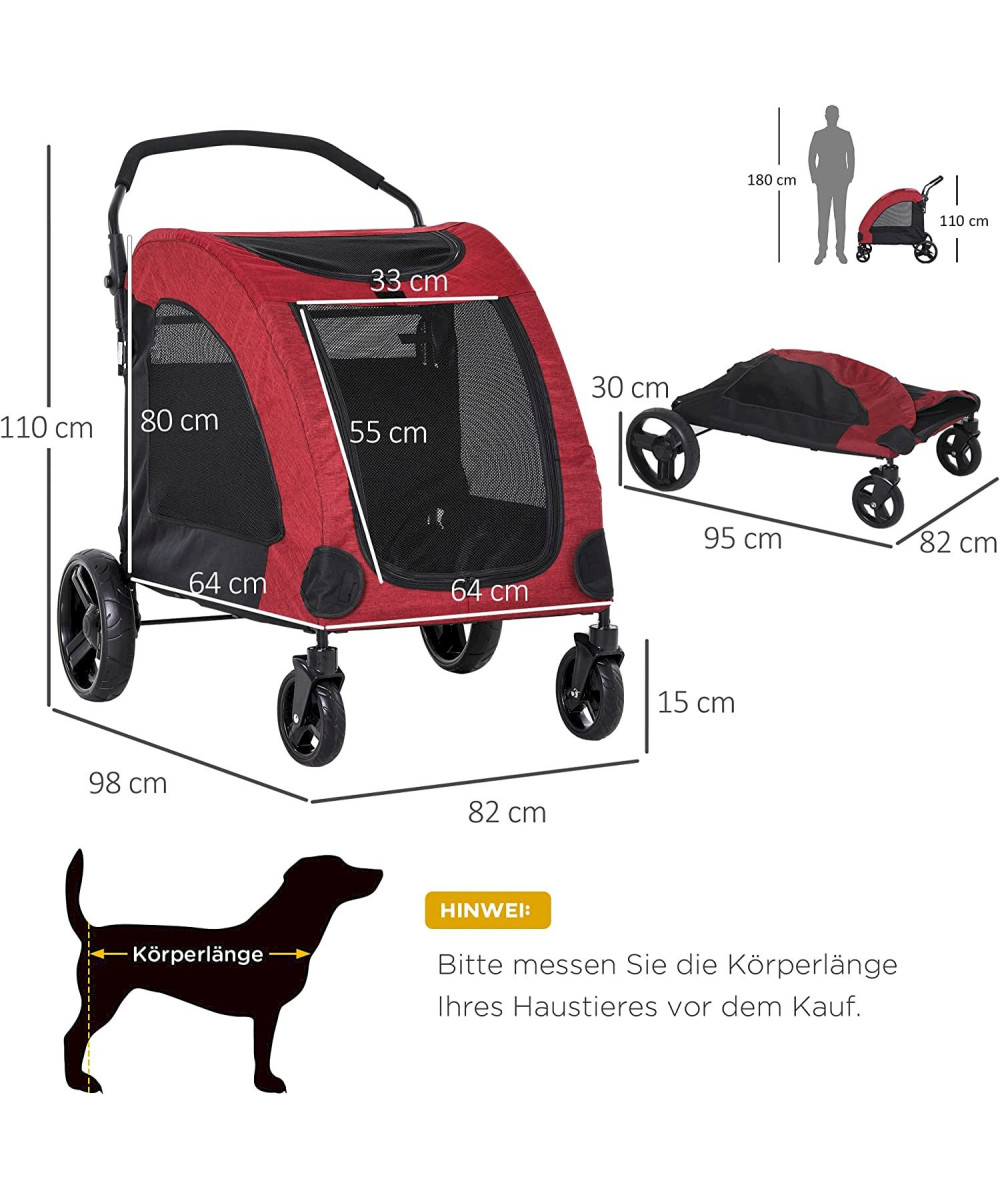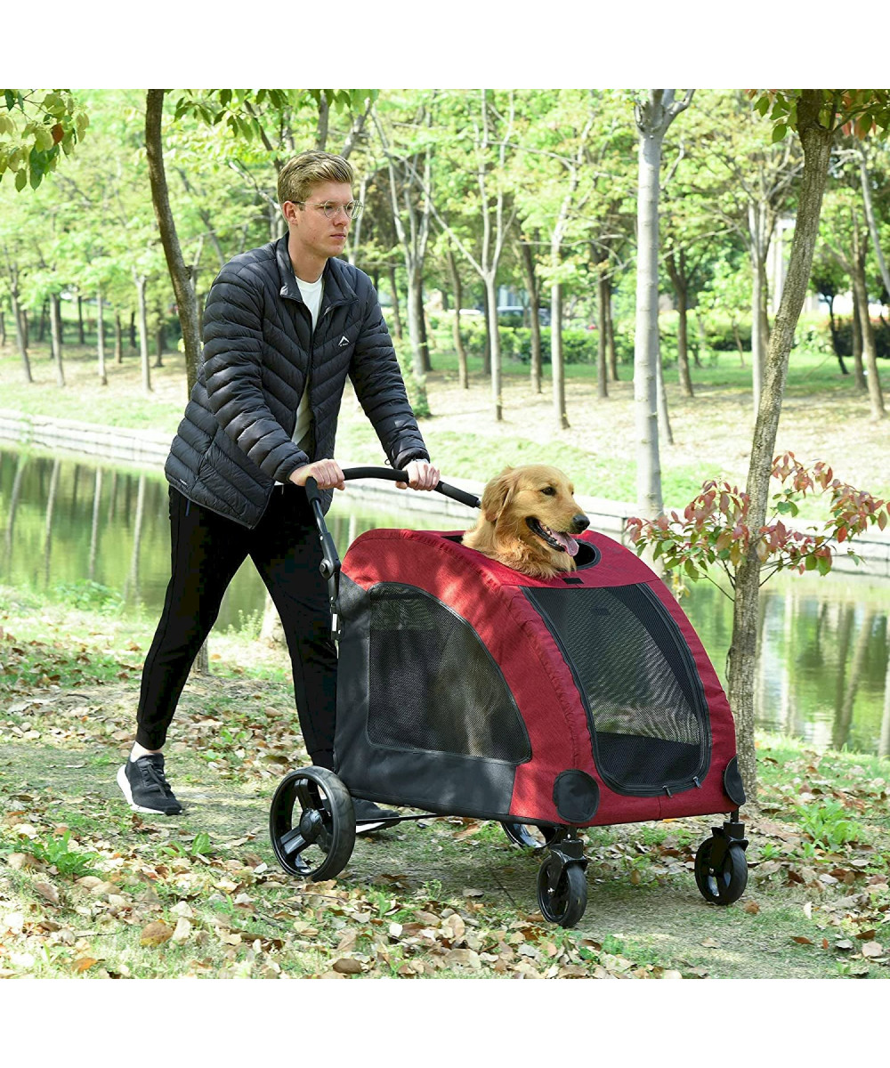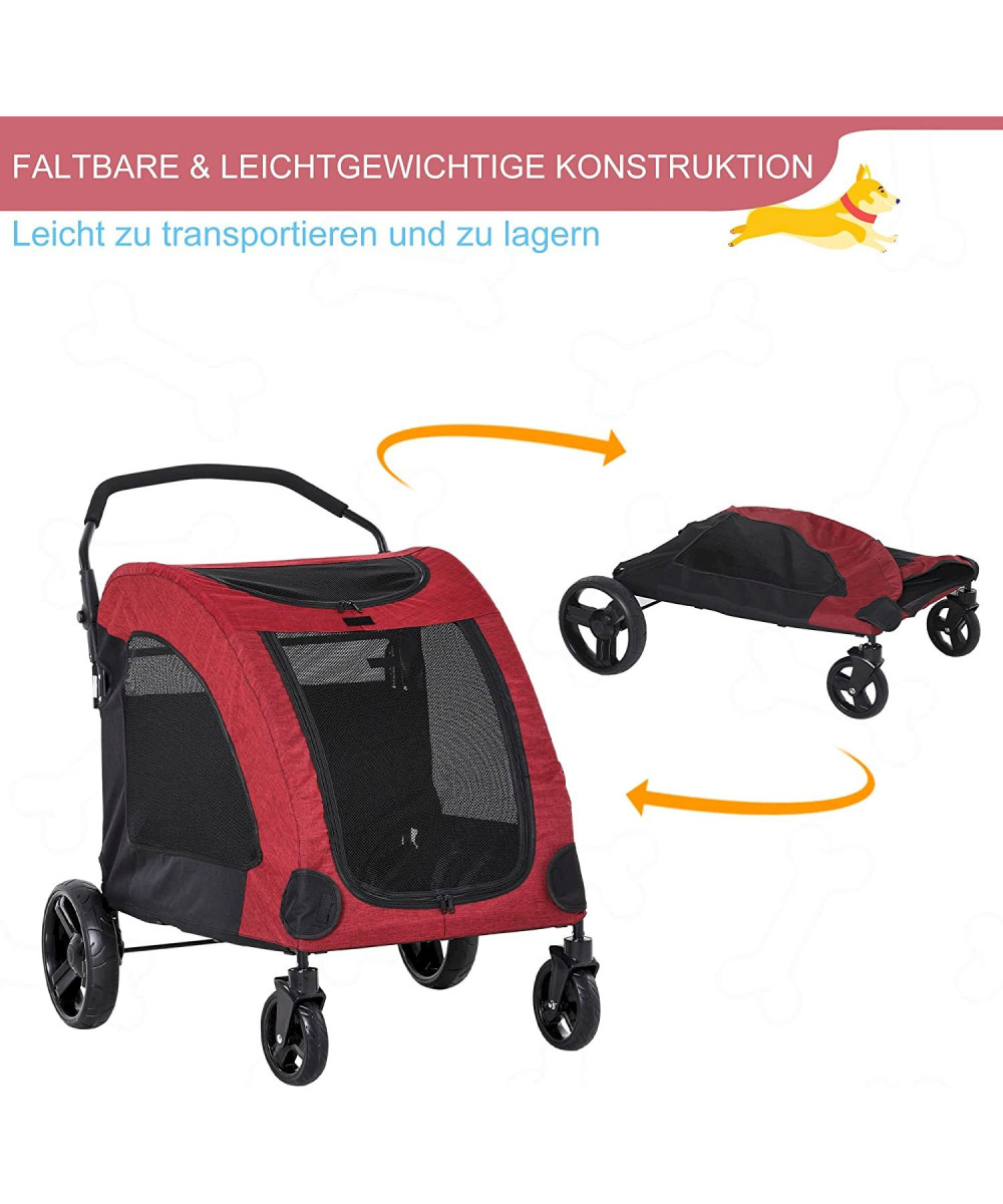 - Équipé de 4 grandes roues, la poussette pour chien tourne en silence et stable. Les roues avant peuvent pivoter à 360 ° et les roues arrière sont équipées de freins.