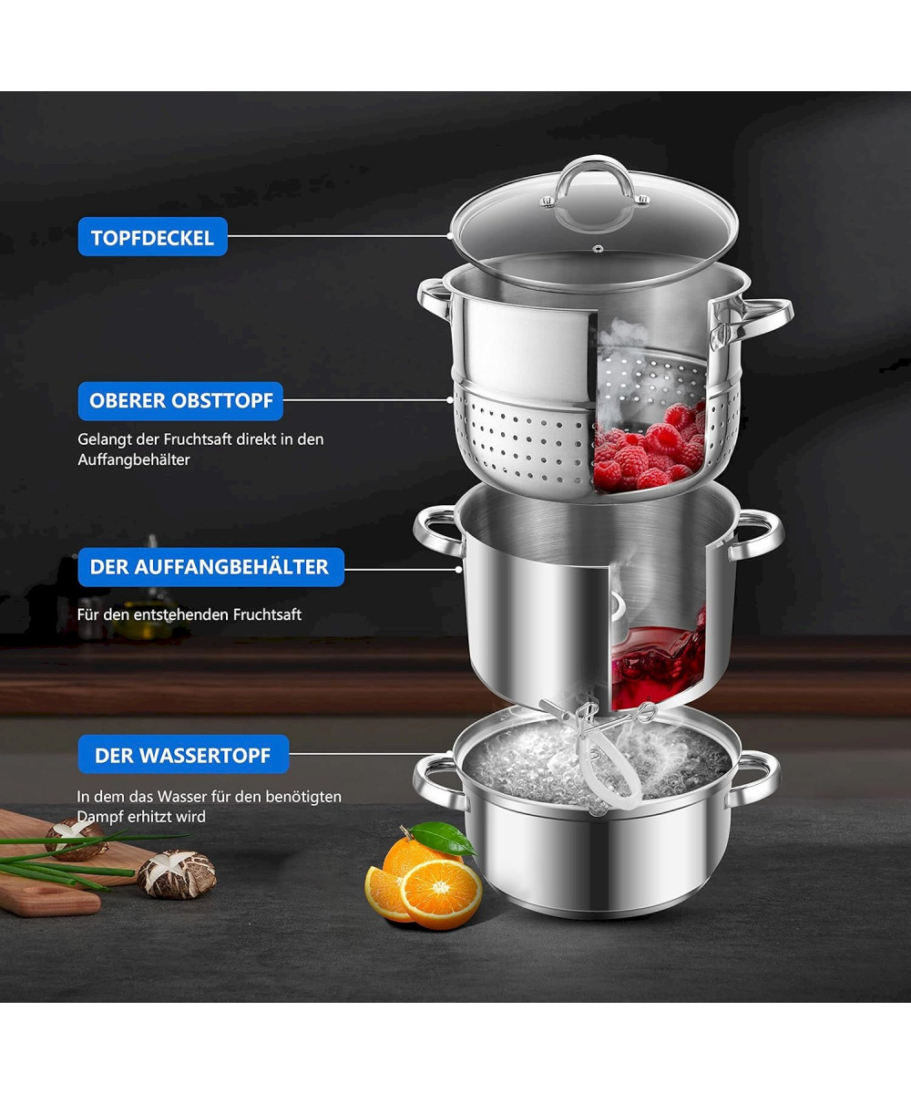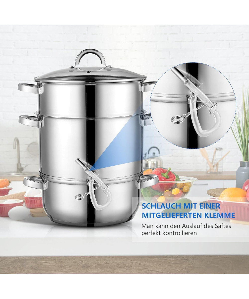 Centrifugeuse à vapeur pratique en acier inoxydable pour tous les foyers pour la préparation de jus, confitures, gelées de fruits ou compotes. L'extracteur de jus est composé d'un réservoir à jus de fruits, d'un réservoir d'eau et d'un tamis. La préparation peut être suivie de manière optimale grâce au couvercle en verre, ce qui permet de ne pas perdre une vue d'ensemble lors de la fabrication. À propos des Le tuyau en silicone de 30 cm de long peut être rempli et essayé. Le fond encapsulé économe en énergie est nécessaire pour l'extraction de jus de fruits et légumes en douceur.