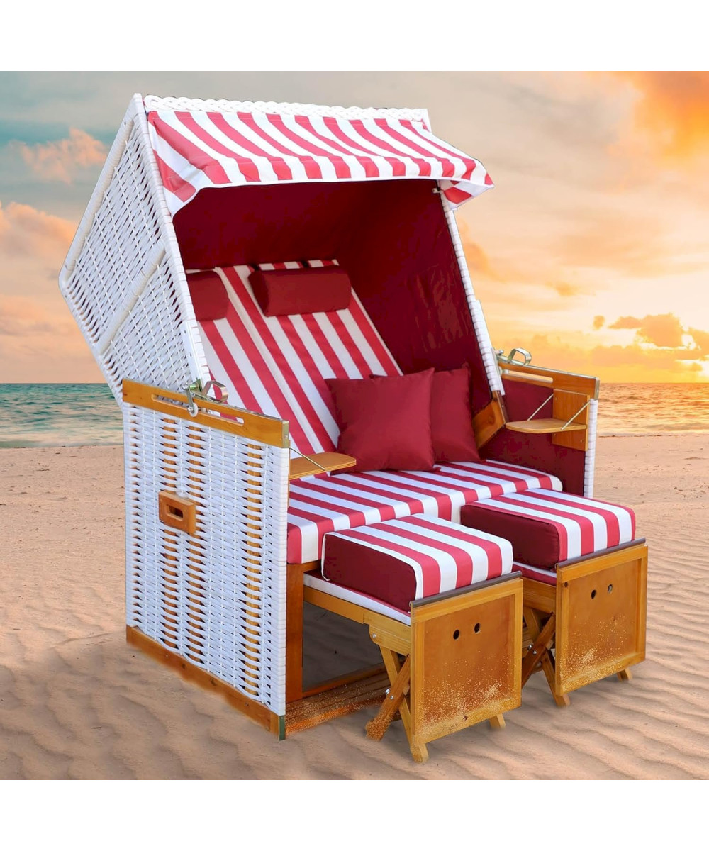 Fauteuil-cabine de plage NORDERNEY DELUXE 120cm de largeur pour 2 personnes rouge/blanc rayé