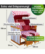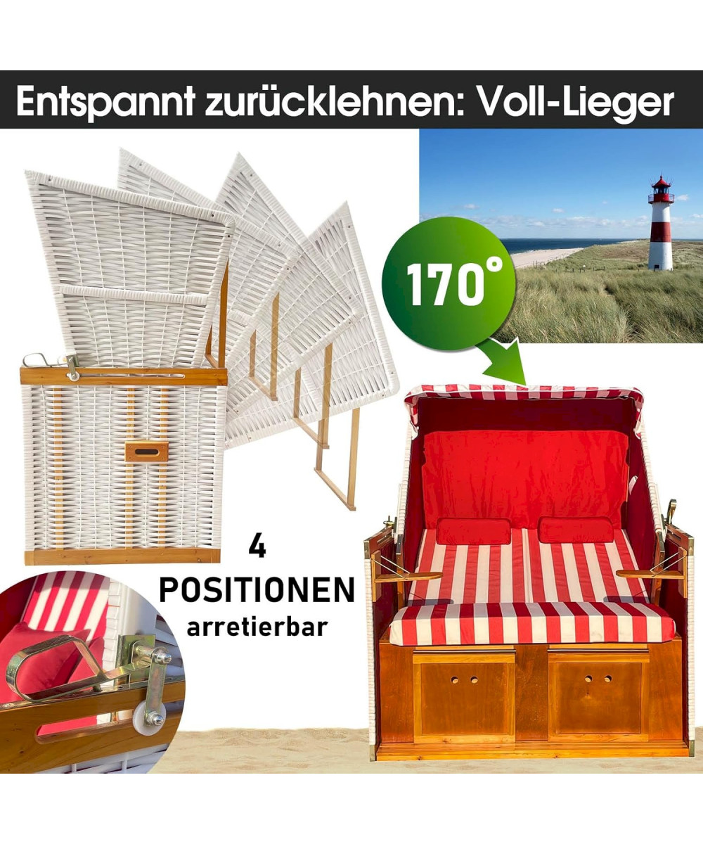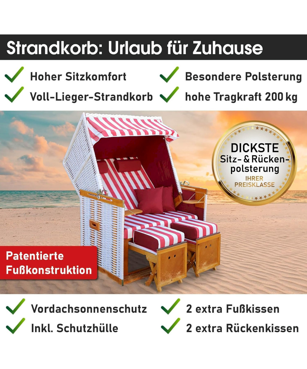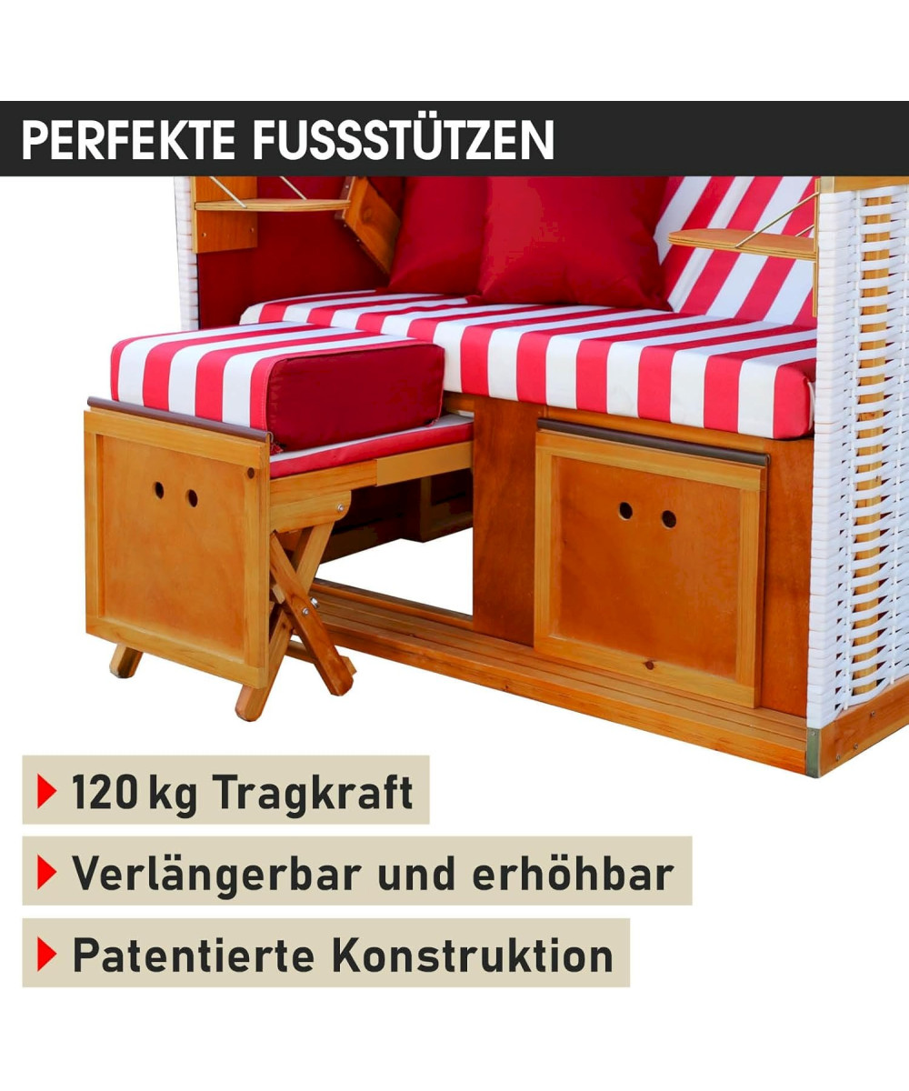 2-Sitzer Strandkorb mit besonders dicker Polsterung, Volllieger Strandkorb für Garten, Terrasse und Balkon, Ausziehbare und höhenverstellbare Fußbänke