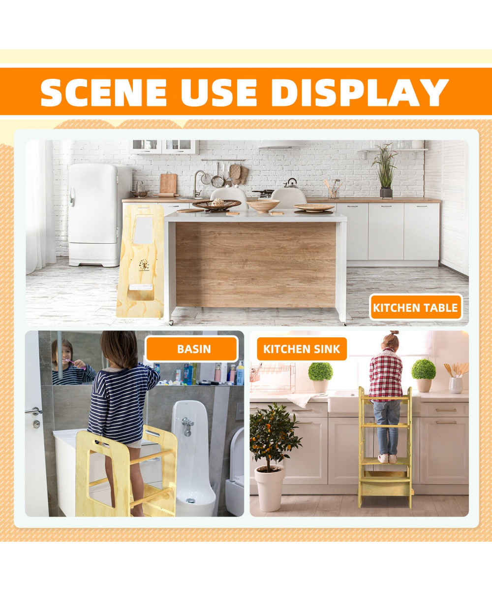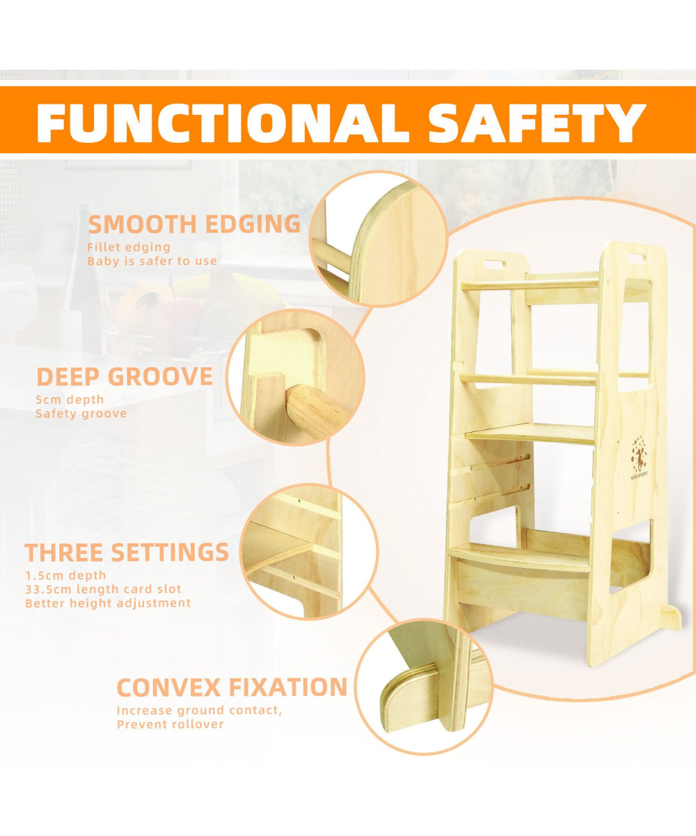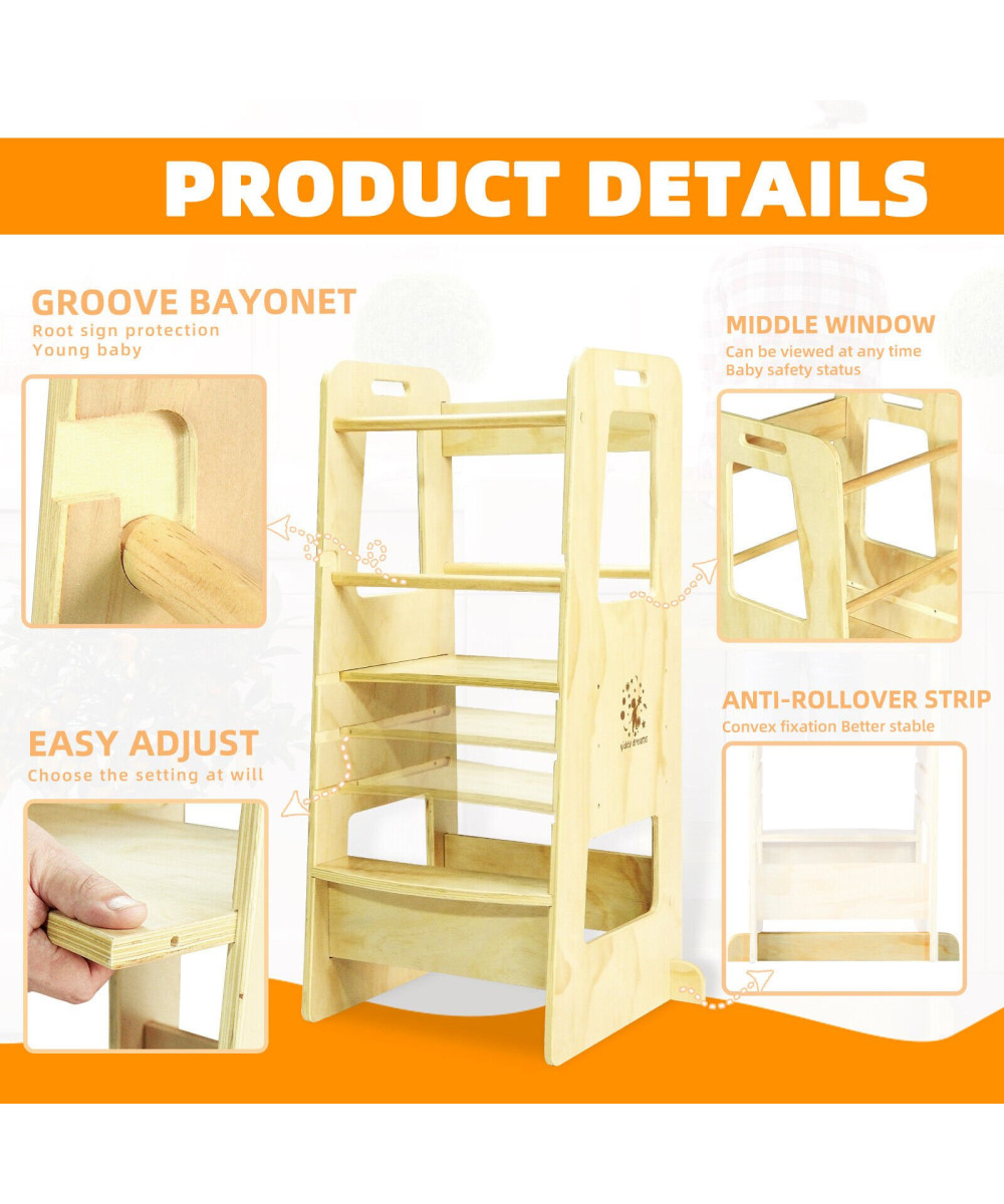 Der Montessori-Lernturm ist nicht nur ein Möbelstück – er macht Kindern eine Welt voller unbekannter und interessanter Erfahrungen zugänglich. Mit besserer Sicht und leichterem Zugang können sie an täglichen Aktivitäten beteiligt werden: Backen, Mixen, Essen zubereiten, Aufräumen oder andere praktische Situationen. Auf diese Weise kann er das Selbstwertgefühl stärken, Selbstständigkeit und Selbstbewusstsein entwickeln und die motorische Koordination perfektionieren.