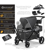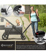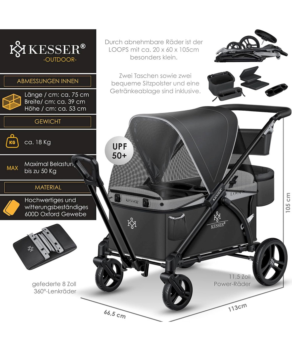 Bénéficiez d'une sécurité optimale et d'une tranquillité d'esprit, grâce aux deux systèmes de ceinture de sécurité à 5 points dans le chariot KESSER LOOPS. Vos enfants sont assis confortablement et sont parfaitement protégés contre une chute du chariot. Avec notre chariot de transport, profitez de moments précieux en toute sécurité, confort optimal et protection optimale contre les intempéries. Suffisamment d'espace pour de délicieux plats, boissons et beaucoup d'espace pour les petits. De plus, les puissants freins assurent un contrôle optimal pendant la conduite. Surtout avec un chariot de jardin traditionnel, il est difficile de contrôler le chariot en pente ; nos freins sont la solution optimale pour ce problème. C'est parti.