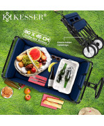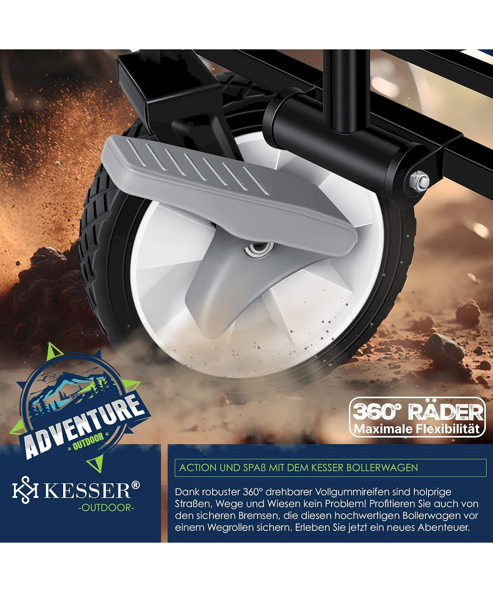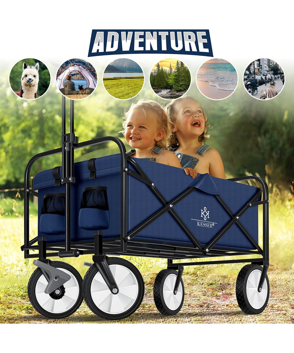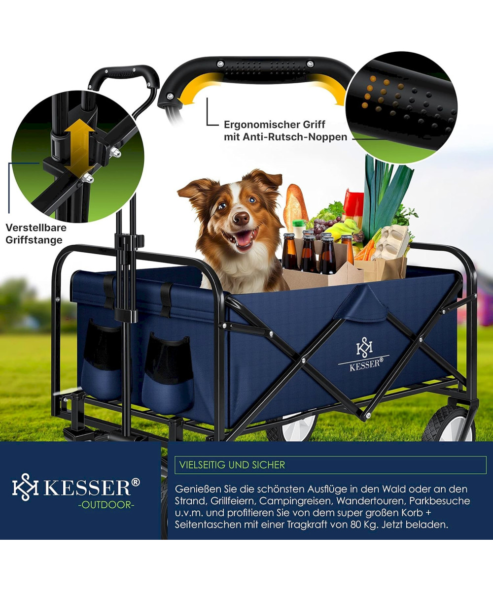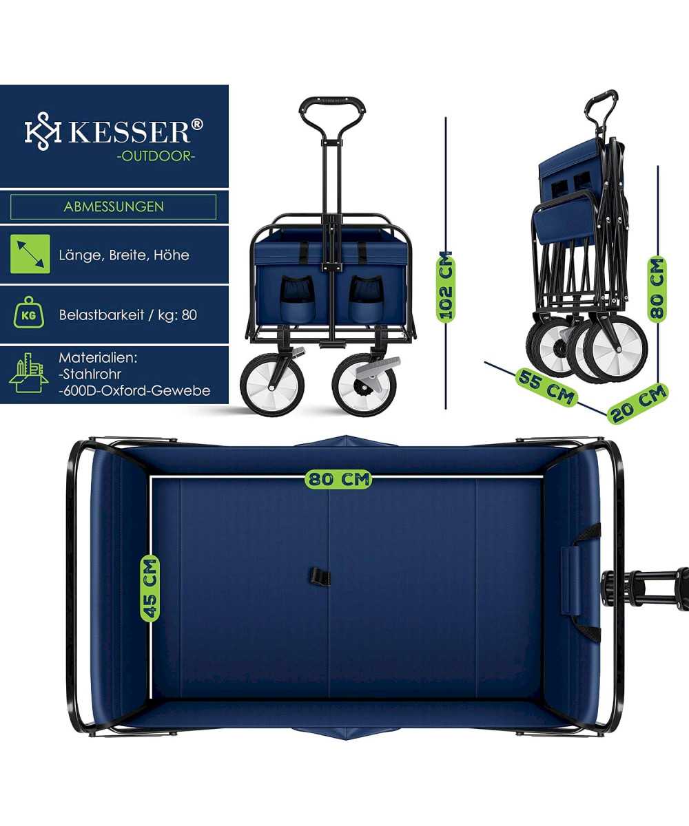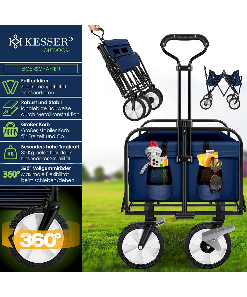 Le chariot pliable Kesser est votre compagnon idéal pour toutes les excursions. Avec sa grande surface de chargement et ses supports supplémentaires pour boissons offrent un espace de rangement pour les excursions avec les enfants, les festivals ou d'autres activités de loisirs, il peut être rapidement monté et rangé pour gagner de la place. Ce grand chariot offre de la place et un grand confort grâce à son cadre rembourré. Laissez-vous séduire En plus des 2 supports intégrés à l'avant pour les boissons et les petits bagages, le chariot est équipé de poignées pour tirer ou pousser, ainsi que de roues pivotantes à 360° et de freins. En quelques gestes, le grand chariot peut être plié et rangé pour économiser de l'espace. Profitez de nombreuses excursions avec ce chariot pliable Car avec ce chariot de transport pliable, il peut y avoir un peu plus de bagages Convient pour le camping, les barbecues, les courses dans un centre commercial, la randonnée dans un parc ou d'autres activités de plein air - Offre de l'espace pour les excursions avec les enfants, les festivals ou d'autres activités de loisirs, il se replie de manière compacte si nécessaire. Il dispose d'une poignée réglable au milieu avec fonction d'inclinaison et d'une roue avant rotative à 360°. Le matériau résistant et la construction du cadre stable offrent une charge maximale : jusqu'à 80 kg.