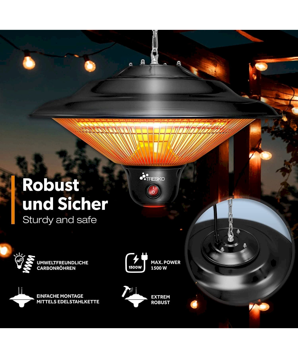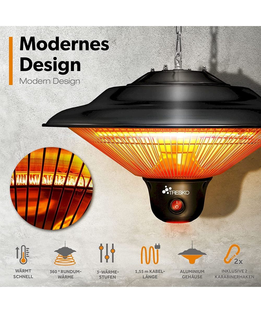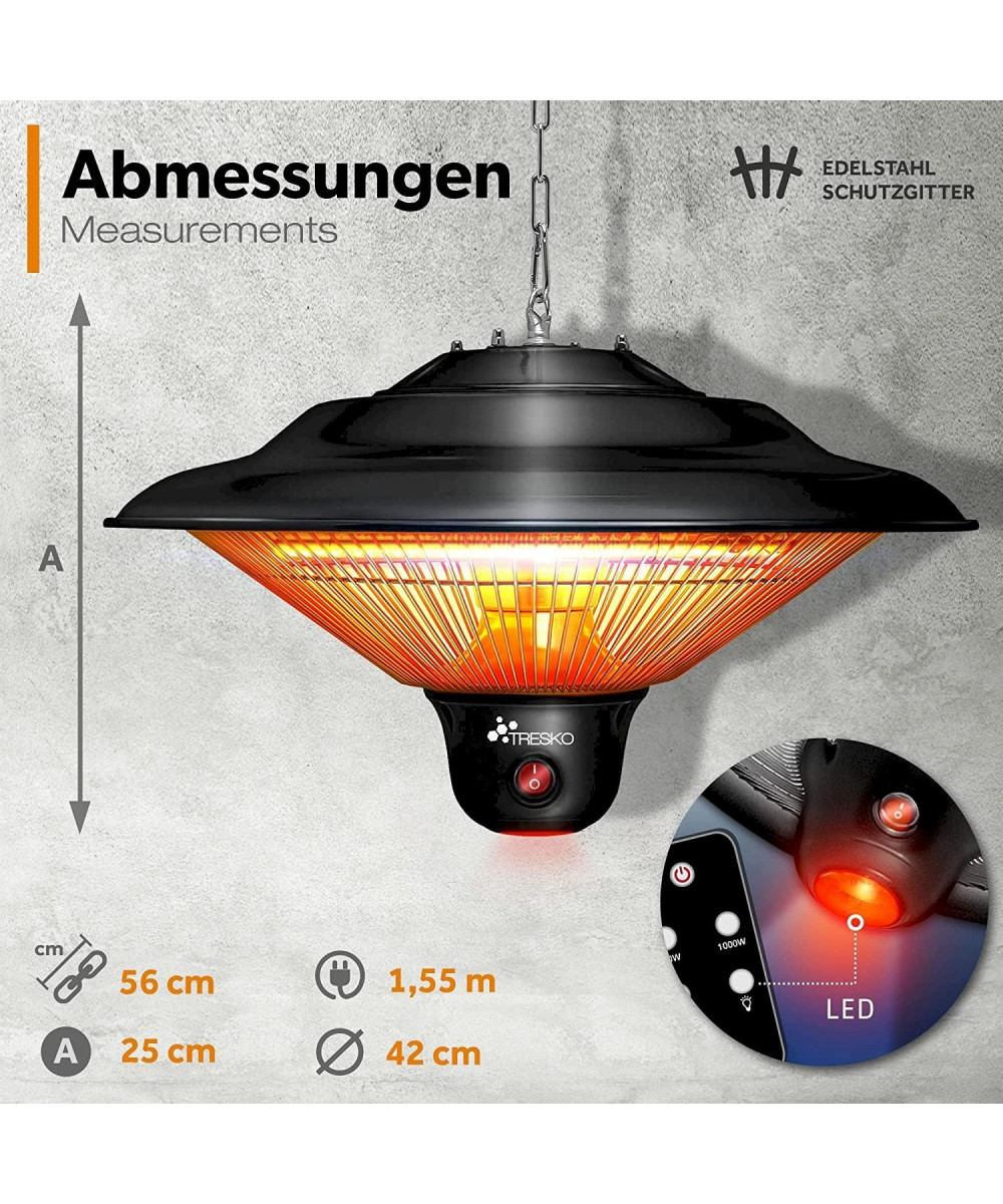Durch die enthaltene Edelstahlkette (Länge: 56cm) und den Karabiner-Haken lässt sich der Terrassenheizer ganz einfach an der Decke aufhängen . Der TRESKO Heizstrahler verfügt über ein Edelstahl Schutzgitter und Aluminium Gehäuse .