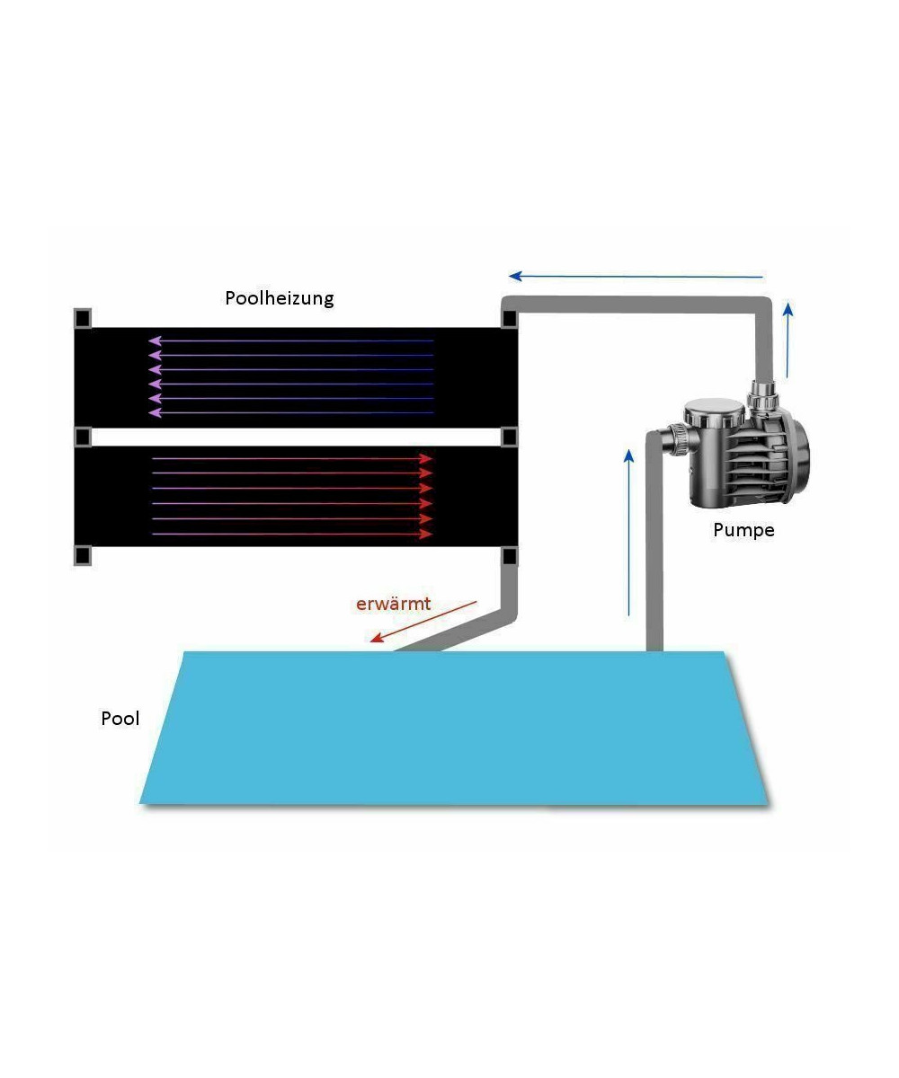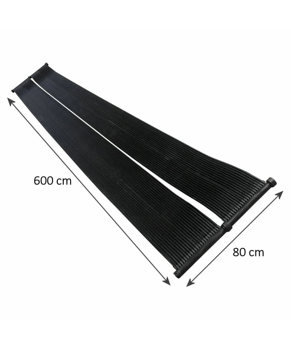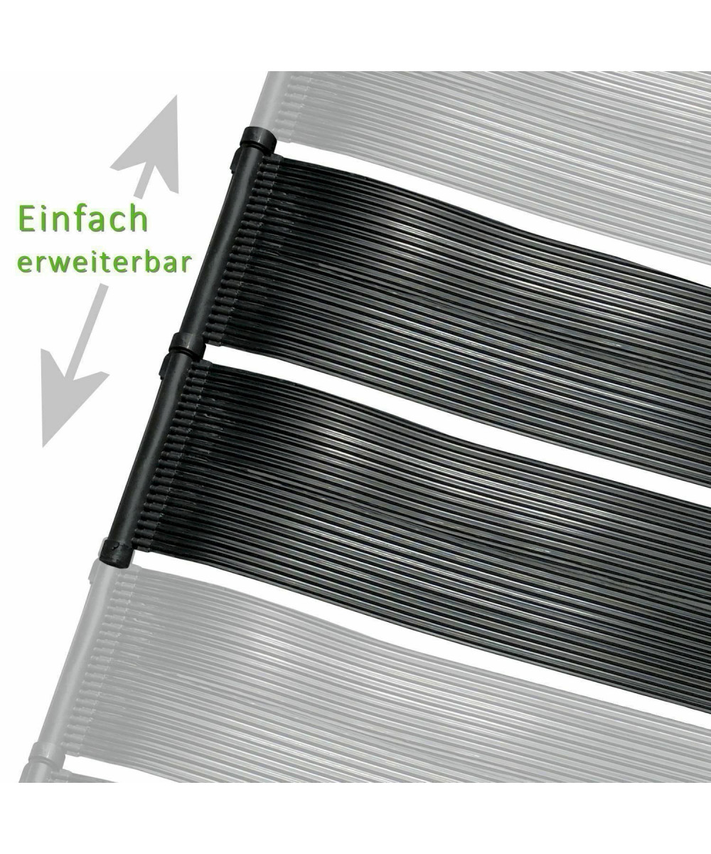 Sur 600 x 80 cm, l'eau circule dans plusieurs tuyaux du chauffe-piscine et se réchauffe immédiatement. Le développement de la chaleur dépend de nombreux facteurs. Par exemple: durée d'ensoleillement, angle d'irradiation, température extérieure et bien plus encore. Les accessoires de connexion sont également inclus dans la livraison.
