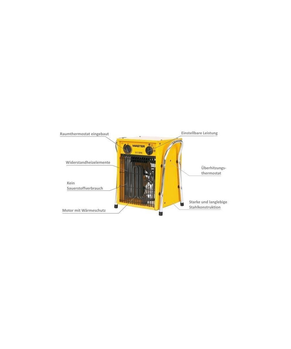 Le générateur d'air chaud Master électrique avec ventilateur B 5 EPB est un système de chauffage localisé pour des locaux industriels, commerciaux ou résidentiels de petites dimensions, car il se caractérise par une absence de flamme vive et d'émissions. Ces chauffages peuvent être utilisés également lorsqu'il est interdit d'utiliser des combustibles tels que le gaz ou le gasoil et dans des lieux clos peu ventilés.