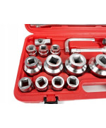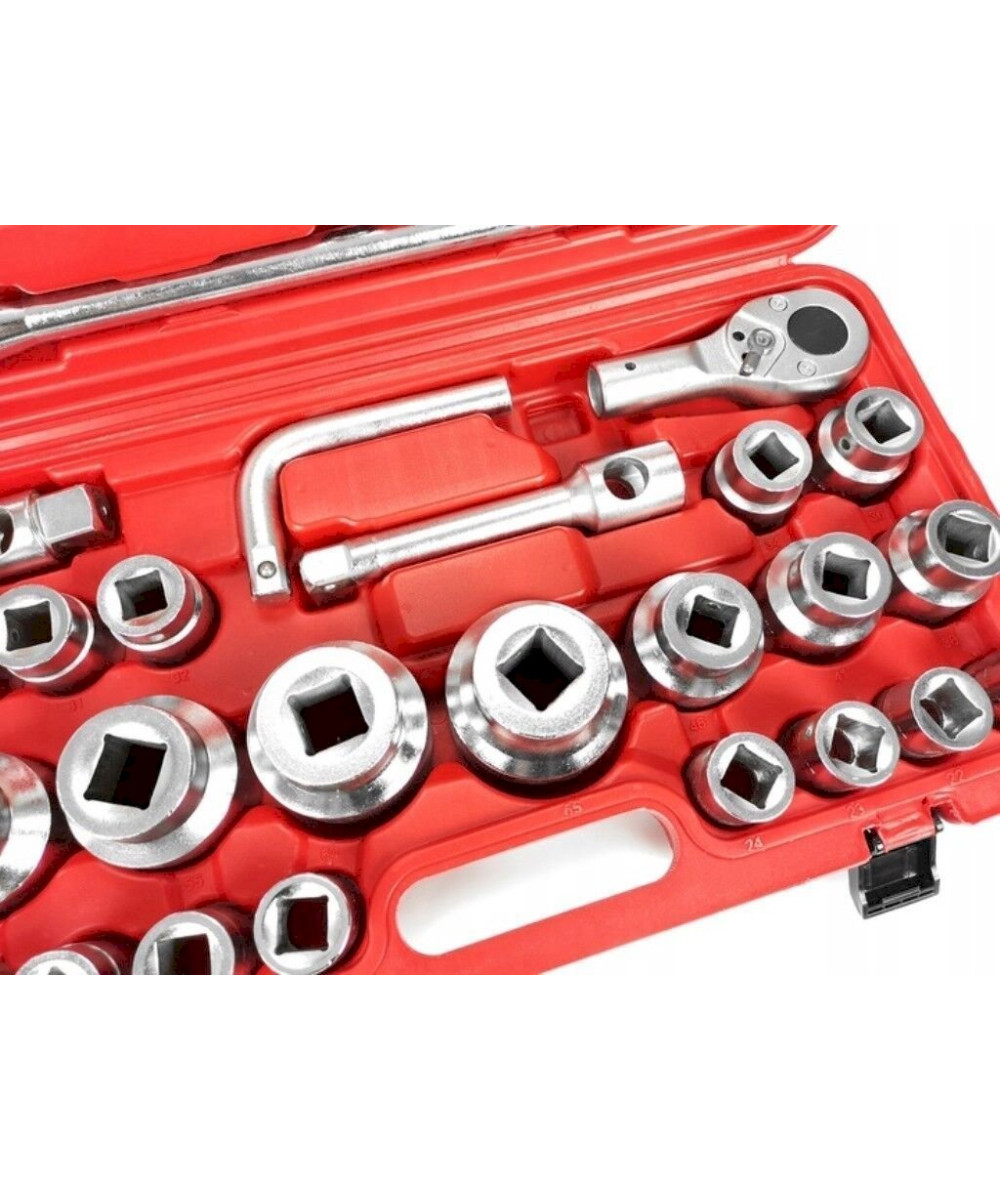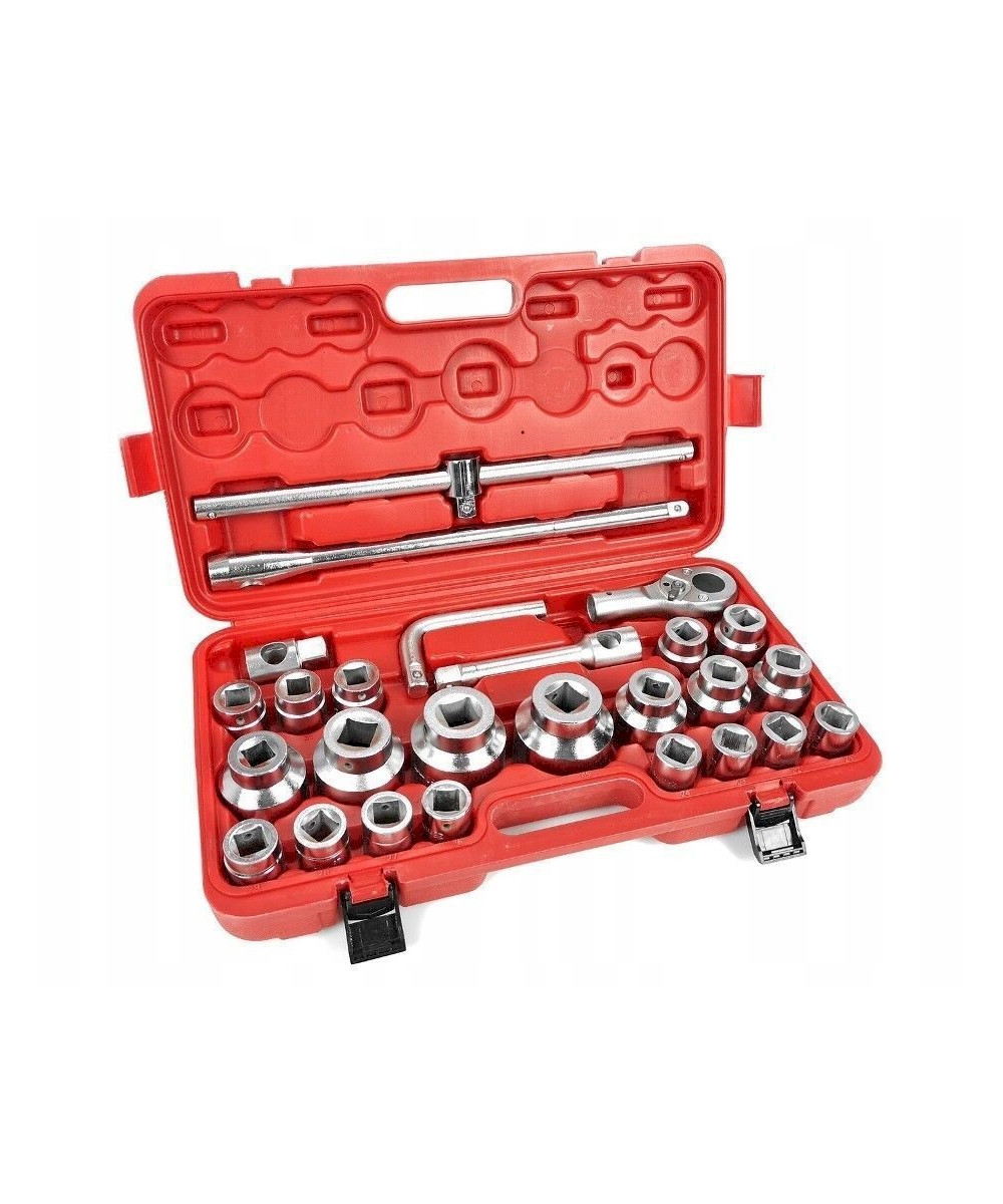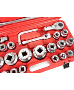 Coffret de douilles composé de 26 éléments. Le kit comprend un jeu de douilles à 6 pans avec prises 3/4" et 1", un bouton en T (3/4"), un cliquet (3/4"), un jeu de rallonges (3/4") et une douille 1". Tous les éléments du kit sont en acier au chrome-vanadium de haute qualité. L'ensemble se trouve dans un coffret pratique en plastique résistant.