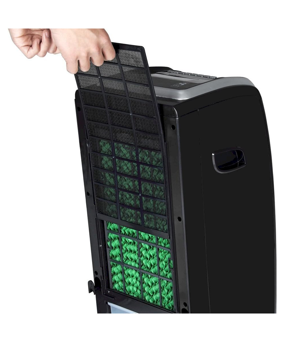 Fonctionnel, l'appareil combine à la fois ventilateur, rafraîchisseur d'air et humidificateur d'air. Grâce à son système d'évaporation d'eau et de glace et à son grand réservoir de 5 litres, le dispositif libère un flux d'air frais et humidifie en douceur l'air de votre pièce.
