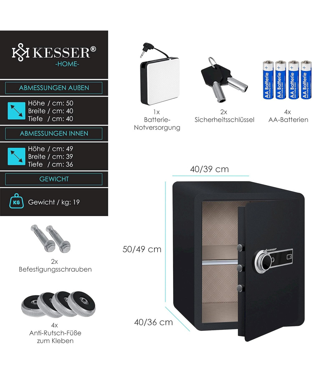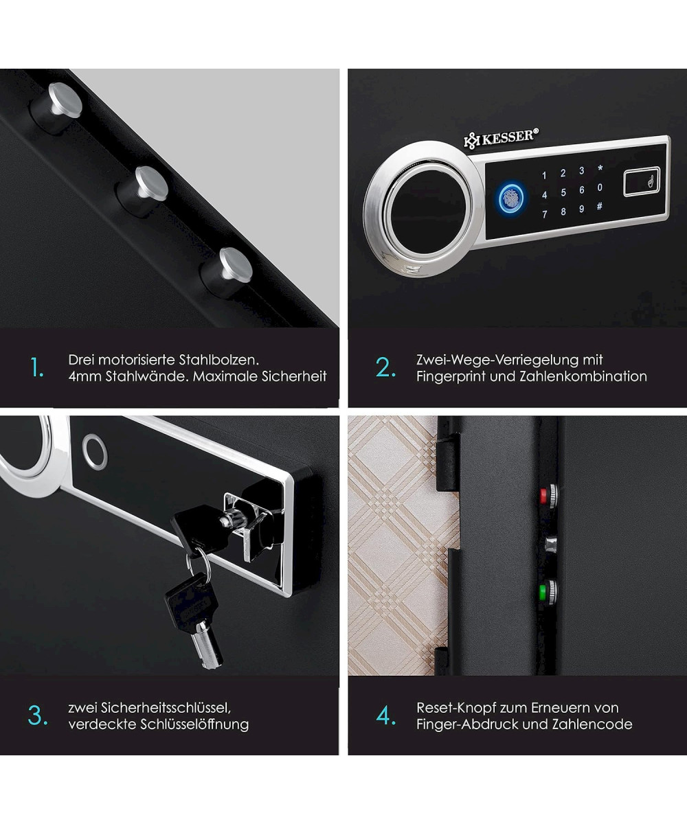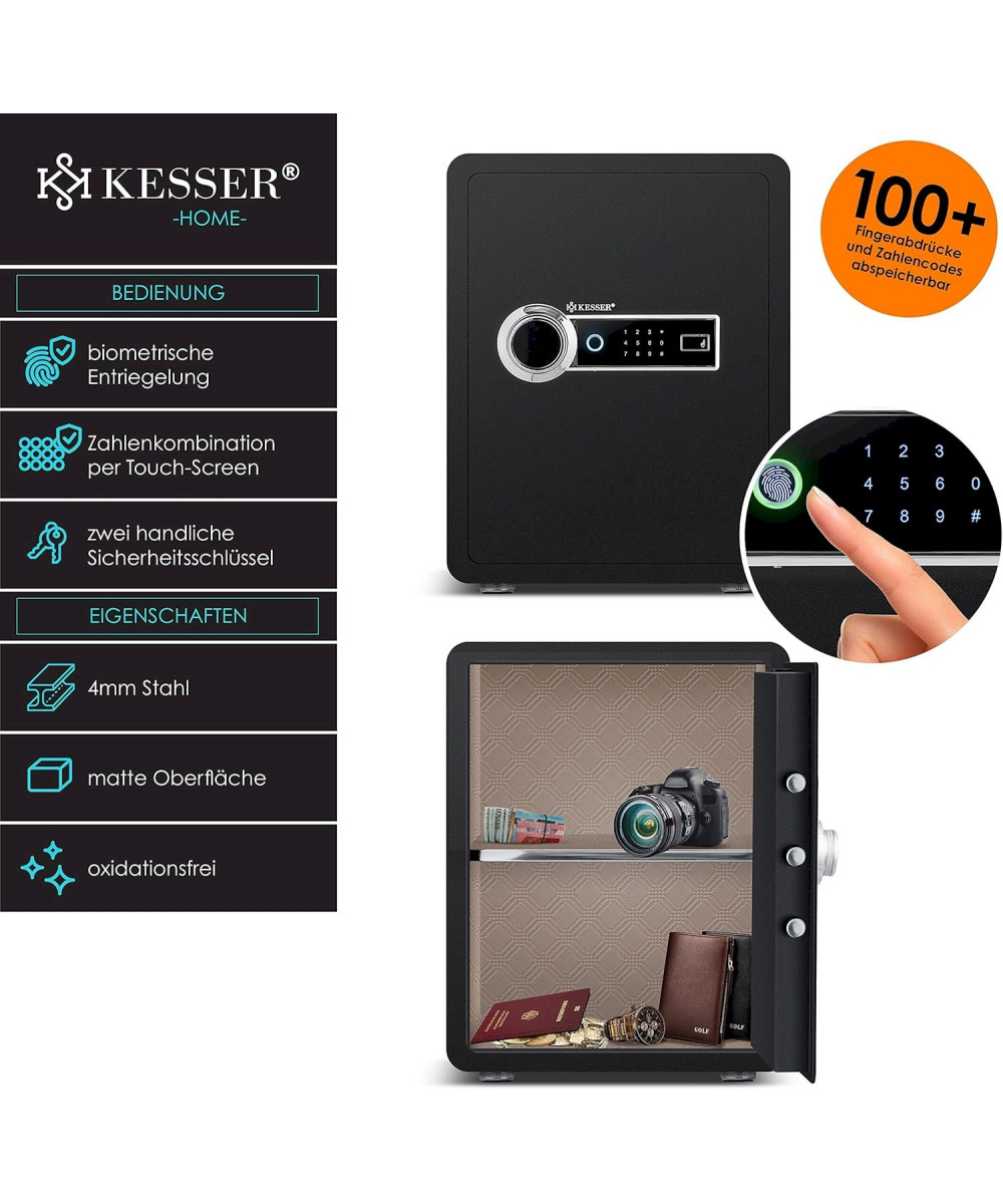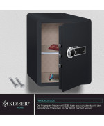 Coffre-fort KESSER avec empreinte digitale, serrure à combinaison électronique et clé de sécurité.