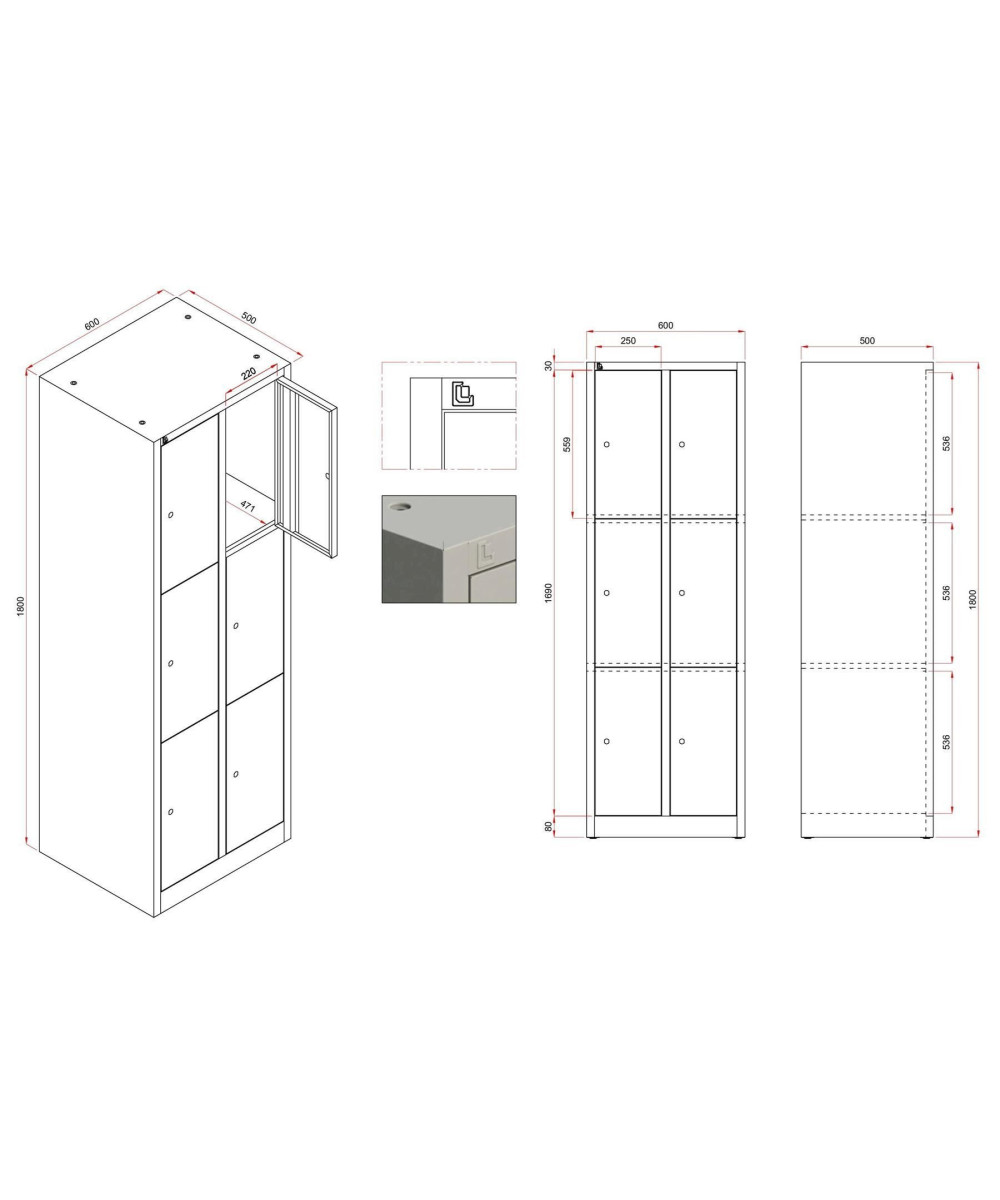 - Jede Fächertür verschließbar durch ein Sicherheits-Zylinderschloss mit jeweils 2 Schlüsseln
