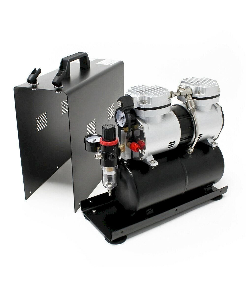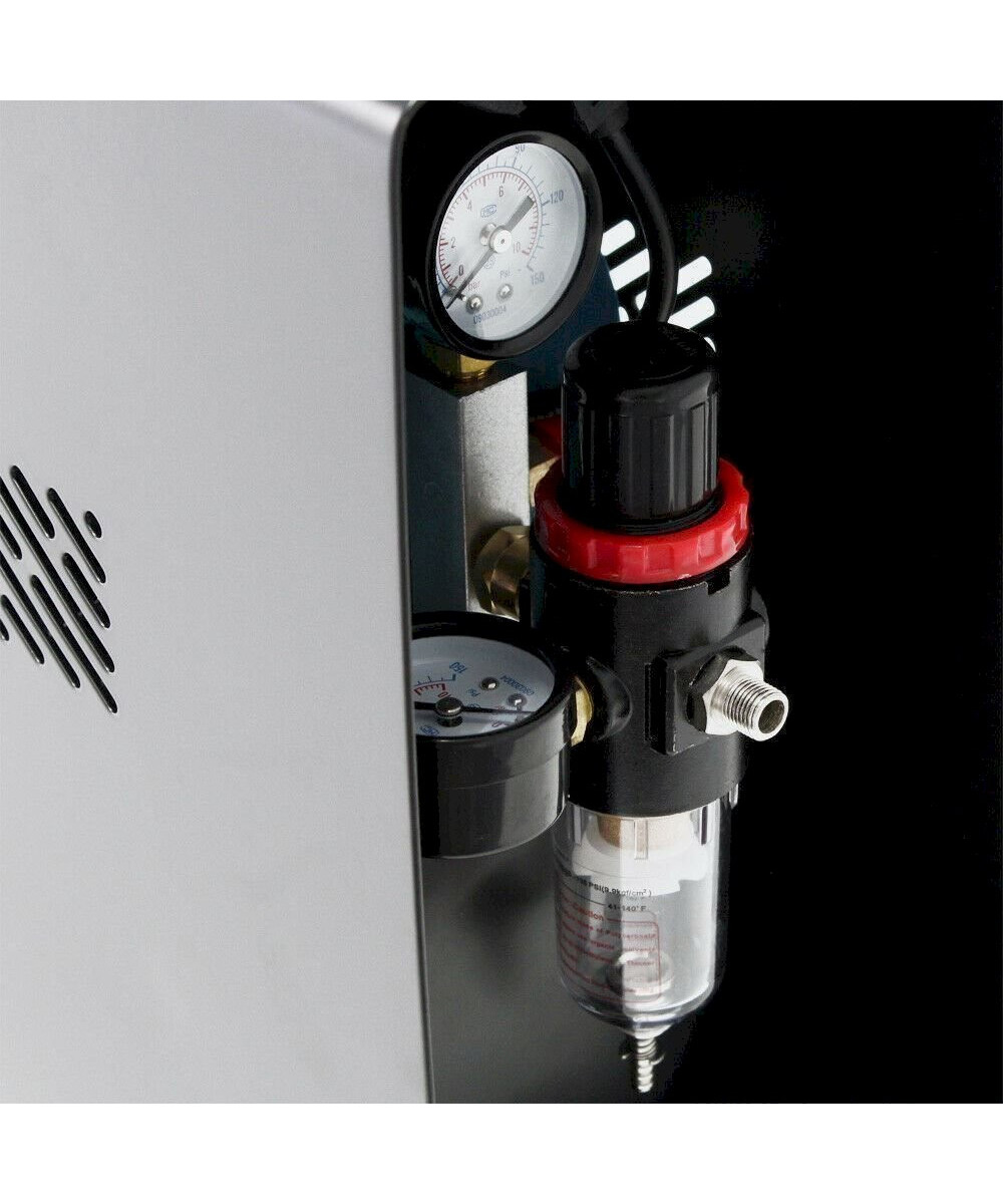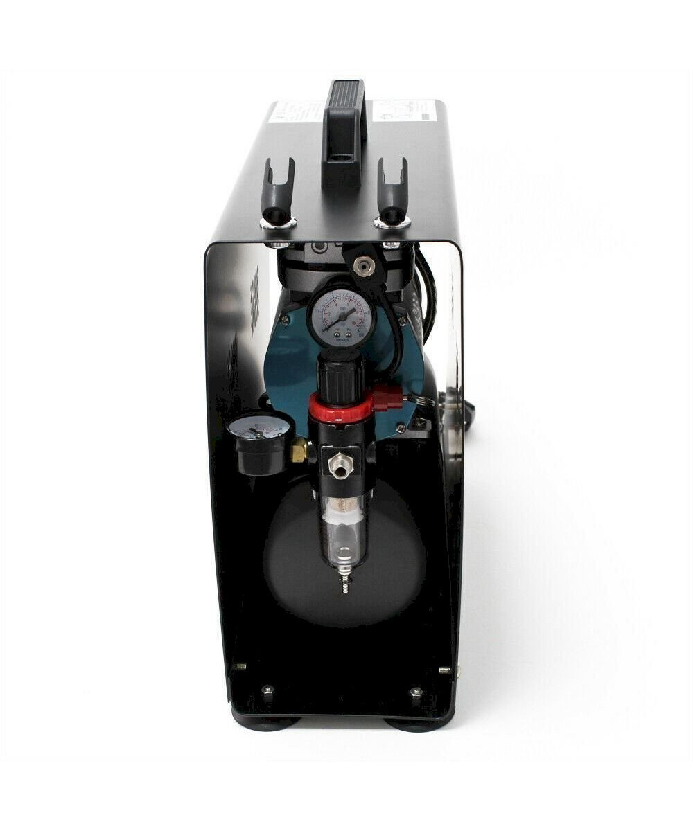La solution intelligente: l'appareil idéal et très perfomant pour tous les travaux de pulvérisation que ce soit pour débutants ou pour professionnels, à utiliser dans le modélisme, la céramique, la poterie, la cosmétique, les salons de manucure, les casques, les reproductions techniques, le tanning, le tatouage, le textile, les studios Nail-Art, les travaux de peinture à eau, ou pour simple pulvérisation. De poids léger et facile à transporter. Très silencieux avec 47 décibels seulement. Le compresseur est totalement automatique et pratiquement sans vibrations. Il fonctionne sans huile et donc sans air pollué. Avec filtre à eau, véritable réducteur d'air comprimé et manomètre.