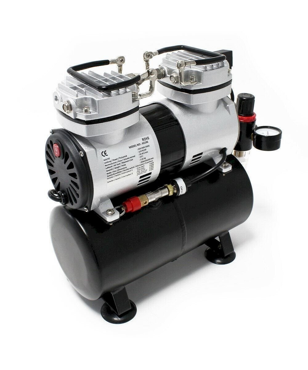 La solution intelligente: l'appareil idéal et très perfomant pour tous les travaux de pulvérisation que ce soit pour débutants ou pour professionnels, à utiliser dans le modélisme, la céramique, la poterie, la cosmétique, les salons de manucure, les casques, les reproductions techniques, le tanning, le tatouage, le textile, les studios Nail-Art, les travaux de peinture à eau, ou pour simple pulvérisation. De poids léger et facile à transporter. Très silencieux avec 45 décibels seulement. Le compresseur est totalement automatique et pratiquement sans vibrations. Il fonctionne sans huile et donc sans air pollué. Avec filtre à eau, régulateur d'air comprimé et manomètre.
