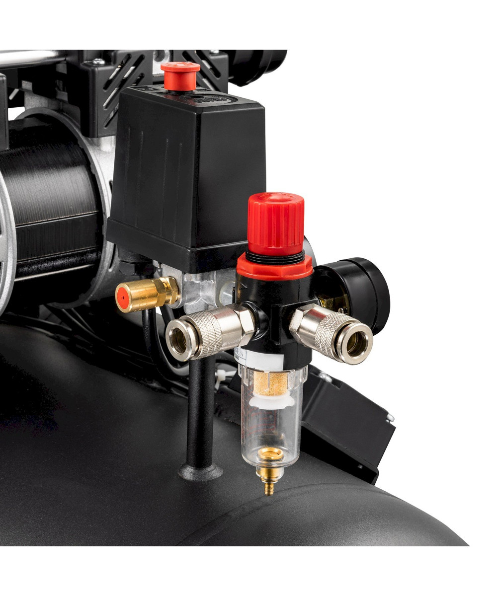 Eine bemerkenswerte Eigenschaft dieses Kompressors ist der integrierte Wasserabscheider. Dieser Filter ermöglicht es Ihnen, Kondenswasser effektiv abzuscheiden und garantiert somit trockene Luft. Ideal für Lackierarbeiten, während gleichzeitig Ihre Geräte geschont werden.