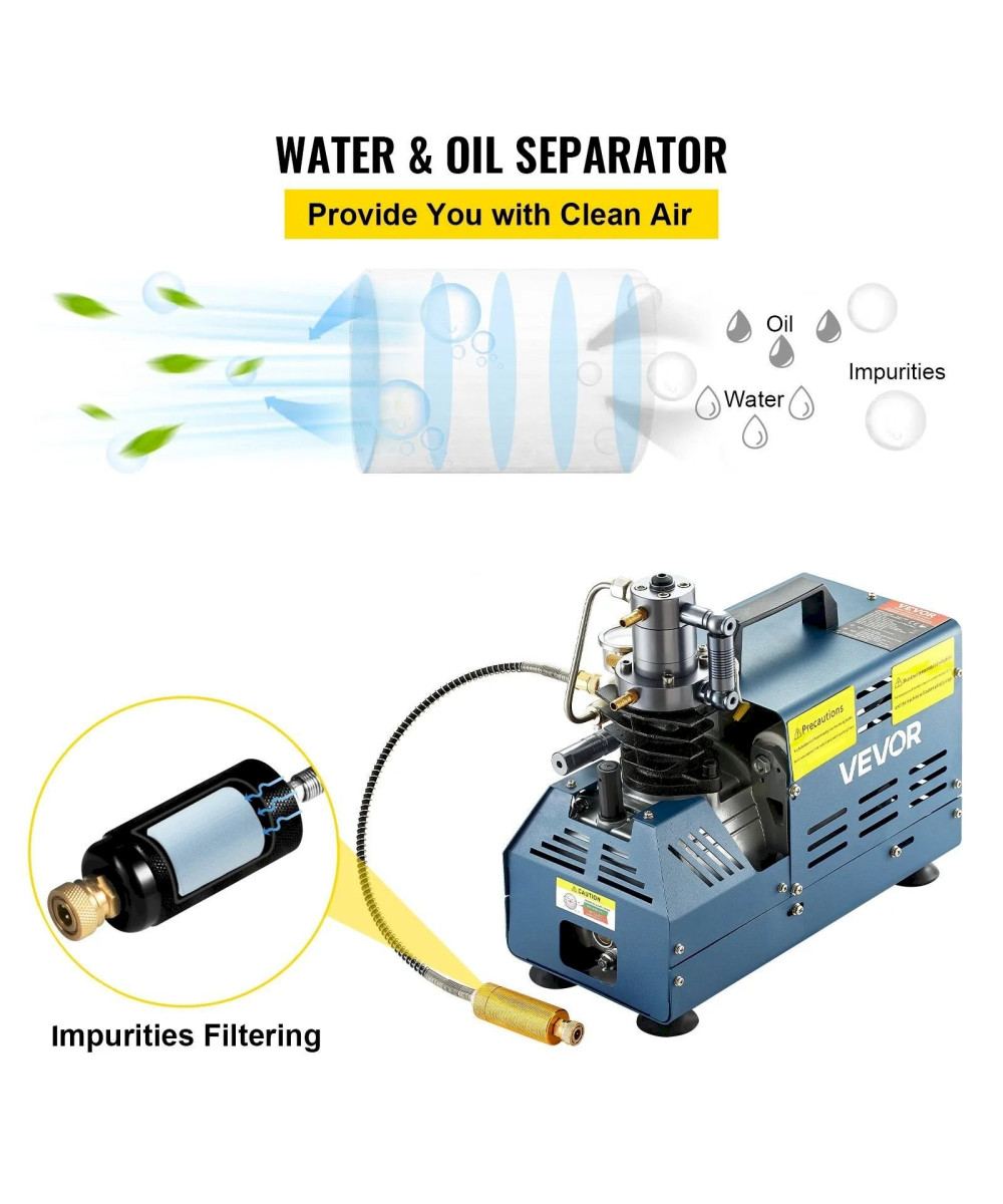 La pompe est un compresseur PCP de 1800W avec une compression à deux étages. Avec une fonction d'arrêt automatique, vous pouvez prédéfinir la pression dont vous avez besoin avant que la machine ne démarre et la pression de travail maximale est de 4500PSI. Le compresseur adopte un système de filtrage par séparateur d'huile/eau et un système de refroidissement par eau, ce qui garantit des performances stables et une longue durée de vie. En outre, le compresseur est doté d'un affichage de la température par LED, d'une soupape antidéflagrante et d'un cylindre en acier inoxydable. Convient aux bouteilles de plongée, aux fusils à air comprimé, aux bouteilles de paintball, aux bouteilles de plongée, aux pistolets à air comprimé, etc.