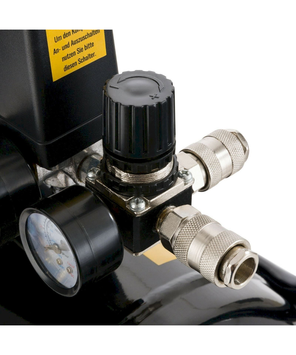Zwei Manometer für Behälter- und Arbeitsdruck liefern einen schnellen Überblick. Eine enorme Erleichterung zwischen den Arbeitsvorgängen bietet die zweifache Euro-Schnellkupplung , die einen besonders schnellen Werkzeugwechsel begünstigt. Möchten Sie den Arebos Luftkompressor transportieren, helfen zwei Räder und ein gummierter Handgriff bei der Handhabung.