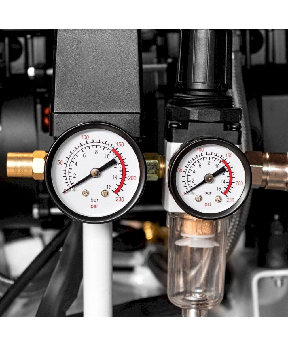 - Raccords - Deux raccords 3/8" à encliquetage (à dégagement rapide) permettent de changer rapidement les tuyaux et les divers outils. Un manomètre indique la pression restante dans le réservoir.