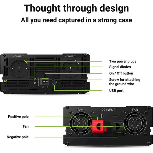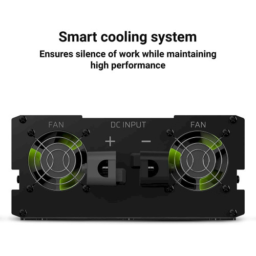 En outre, à l'arrière il y a un ventilateur assurant le refroidissement correct de l'appareil ainsi que des pôles positifs et négatifs sur lesquels les câbles d'alimentation sont vissés. Le bon fonctionnement de l'onduleur est signalé par la diode verte qui brille.