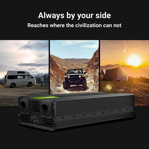 Convertisseur, également appelé inverseur ou onduleur, est un appareil dont la tâche est de modifier la tension continue de la batterie de la voiture ou de la prise allume-cigare en ~230V AC. Le même signal se trouve dans les prises electriques domestiques (type E) dans toute l’Europe. L'onduleur est un excellent choix pour les personnes qui souhaitent voyager en voiture, en camping-car ou en camion. Idéal pour les endroits sans accès direct à la prise. Voici des exemples d'appareils pouvant être alimentés à l'aide d'un onduleur:
