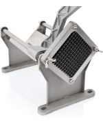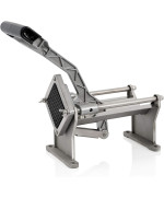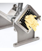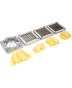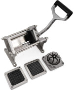 Les 4 inserts de couteaux bien affûtés peuvent être facilement échangés selon les besoins et découpent des bandes d'une épaisseur de 0,6 cm, 0,9 cm, 1,3 cm ou 8 coins. Le coupe-frites peut être monté horizontalement sur le plan de travail ou verticalement sur le mur (matériel de montage NON inclus !).