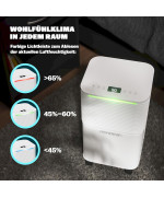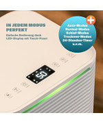 Une barre lumineuse colorée permet de vérifier en un coup d'œil le taux d'humidité actuel. La couleur bleue indique une valeur inférieure à 45 %, le vert une humidité de 45 à 60 % et le rouge une humidité supérieure à 65 %. À côté de l'affichage LED bien lisible se trouvent des boutons tactiles qui permettent de régler la minuterie de 24 heures et les 4 modes de l'appareil d'un simple contact. L'indicateur de niveau d'eau est également très pratique.