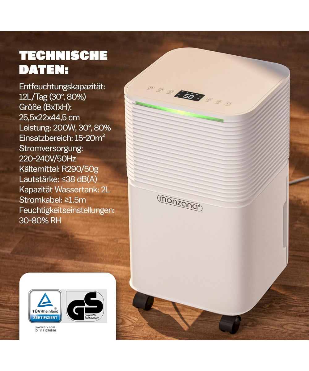 MONZANA Déshumidificateur d’air 15-20m² 12L/jour avec écran LED