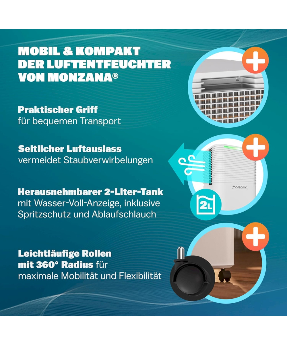 Un taux d'humidité trop élevé peut rapidement entraîner la formation de moisissures dans les pièces. Cela n'est pas seulement inesthétique et endommage les meubles, les livres et les appareils électriques, cela nuit surtout à la santé. MONZANA® offre une solution pratique pour créer un climat intérieur agréable et sain.