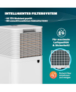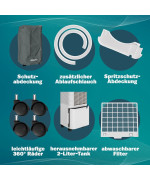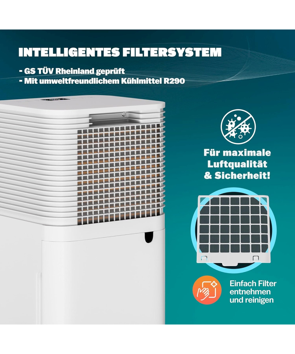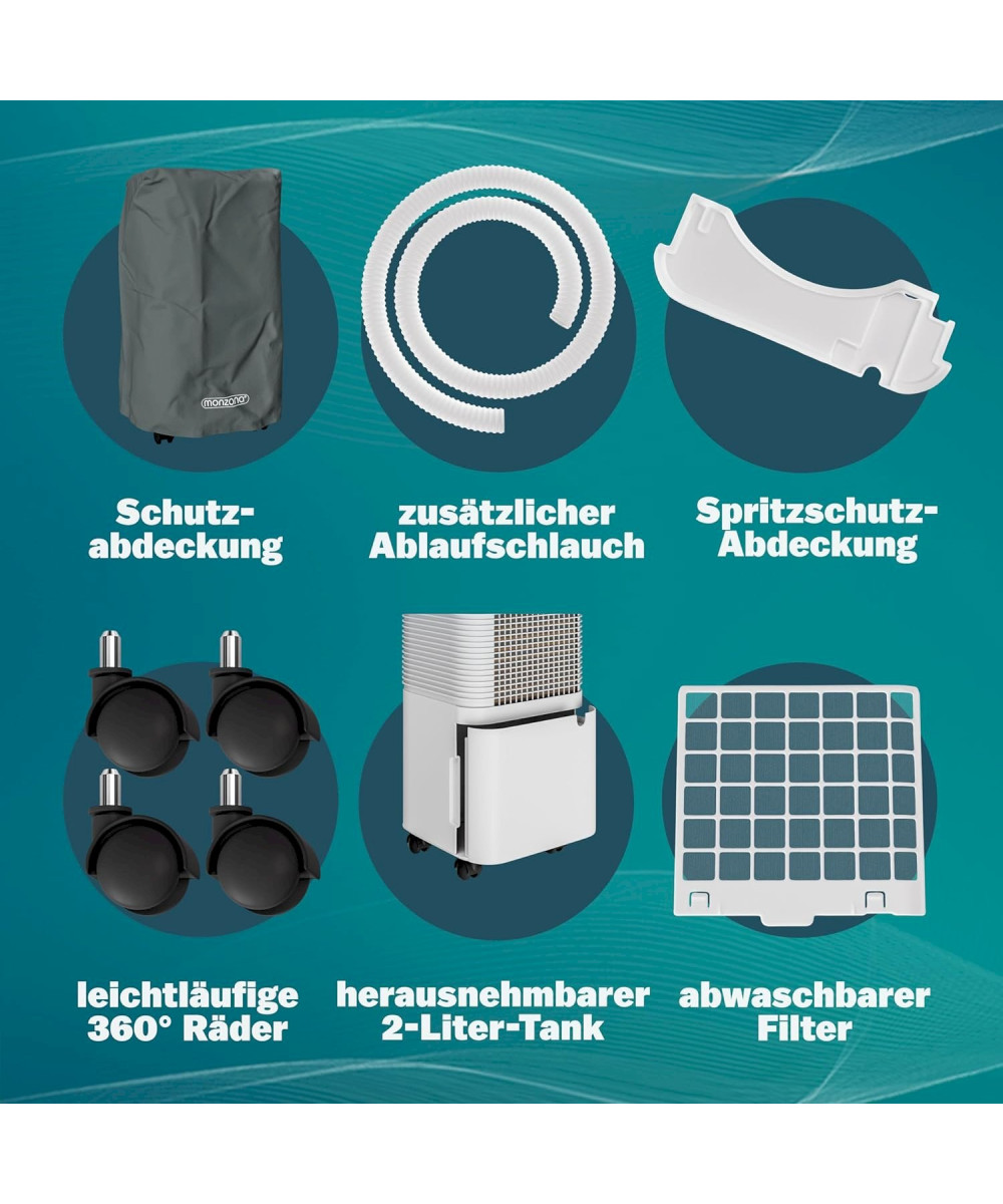 Des roues pivotant à 360° et une poignée à l'arrière permettent de déplacer facilement l'appareil d'une pièce à l'autre et de l'utiliser rapidement là où il est nécessaire. Pour le respect de l'environnement, le réfrigérant utilisé est le R290, qui ne nuit pas à la couche d'ozone et ne contribue pas à l'effet de serre. Un compresseur à piston intégré permet de réduire le bruit et un indicateur de niveau d'eau rend l'appareil encore plus agréable à utiliser.