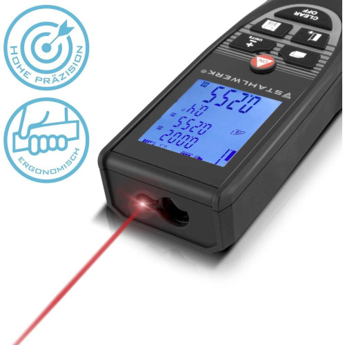 Le télémètre laser LE-100 ST de STAHLWERK fonctionne dans une plage de mesure de 0 à 100 mètres avec une précision de mesure de + /- 1,5 mm. Ce télémètre précis est adapté à la mesure de distances ainsi qu'à la détermination exacte de volumes. Le télémètre laser dispose en outre d'une méthode de mesure indirecte de Pythagore pour calculer les hauteurs en fonction des longueurs de base mesurées. Ainsi, le télémètre convient bien à la détermination de la hauteur et du volume d'une pièce. En outre, l'instrument de mesure permet d'additionner et de soustraire facilement des distances. Les valeurs mesurées peuvent être affichées en mètres, en pouces et en pieds. L'appareil détermine également le minimum et le maximum à partir de plusieurs valeurs. Le télémètre laser tient bien en main grâce à la forme ergonomique du boîtier en plastique ABS caoutchouté et résistant aux chocs.