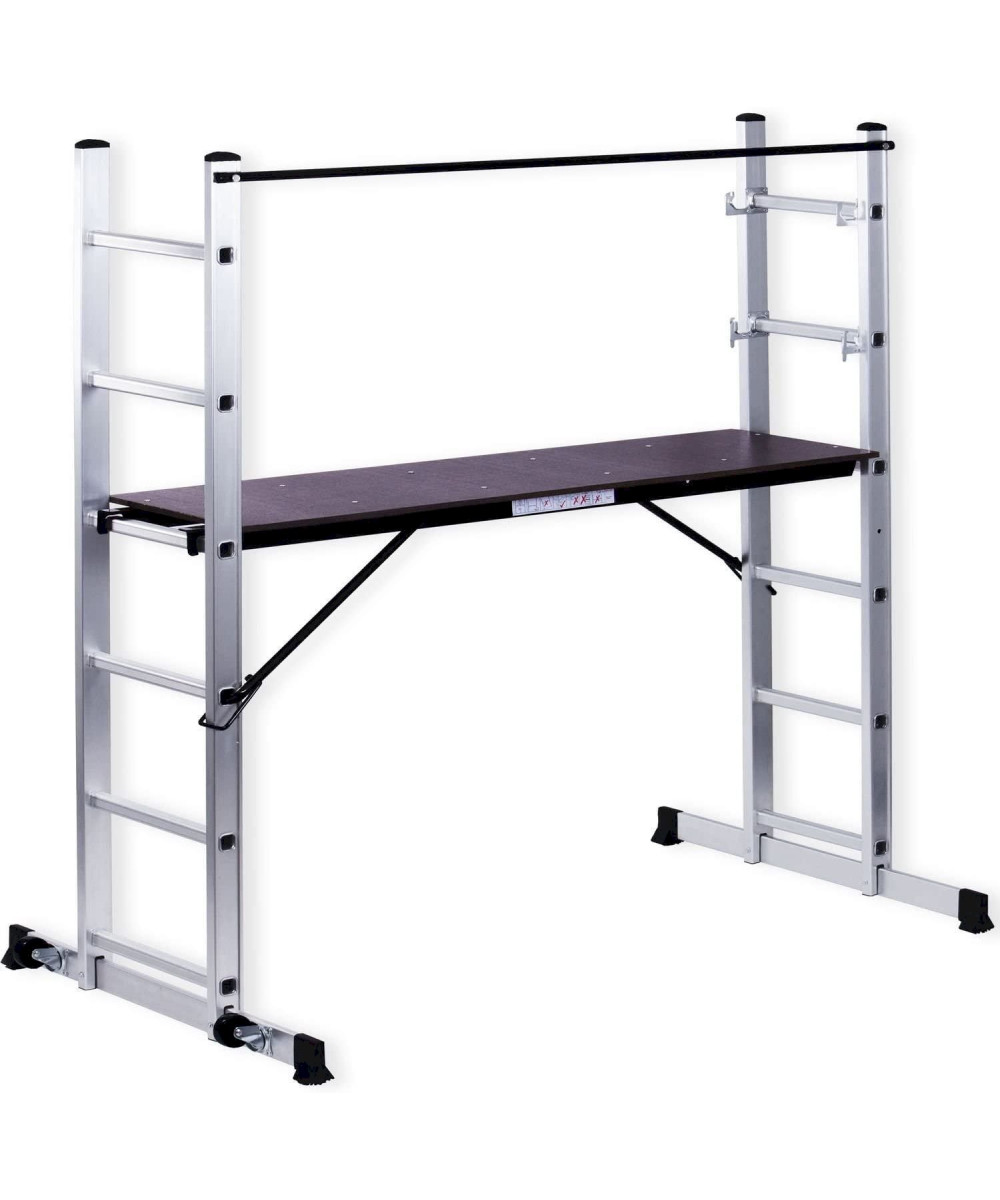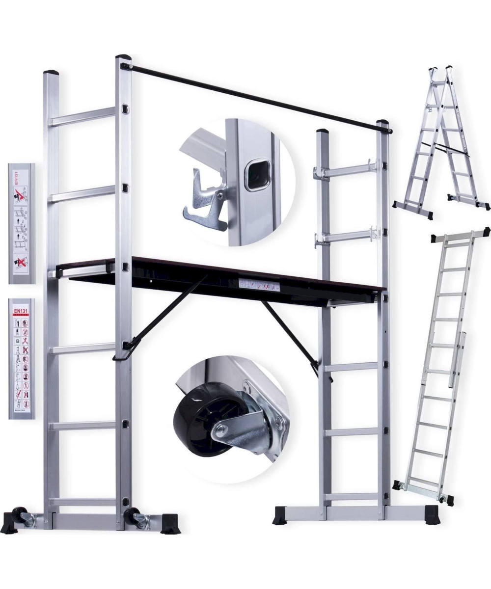 Avec l'échafaudage en aluminium Masko, vous optez non seulement pour un véritable Allrounder mais aussi pour un ustensile universel. L'échelle polyvalente peut être utilisée comme échafaudage, échafaudage ou échafaudage. Un autre point fort est la grande stabilité, ainsi que le plan de travail en bois avec revêtement spécial (antidérapant) qui assurent votre sécurité. L'échafaudage se plie pour un gain de place et est ainsi facile à transporter.