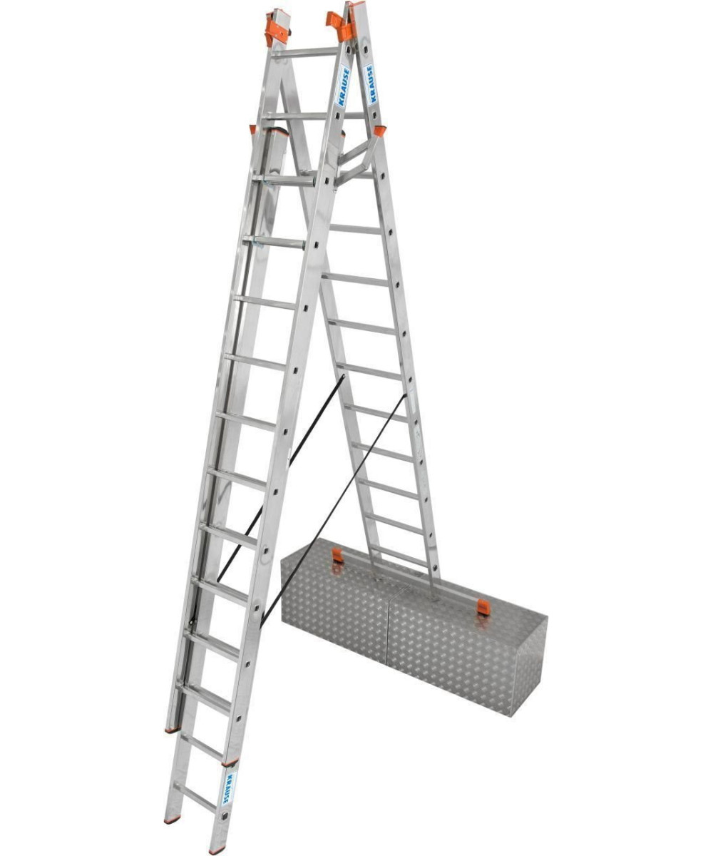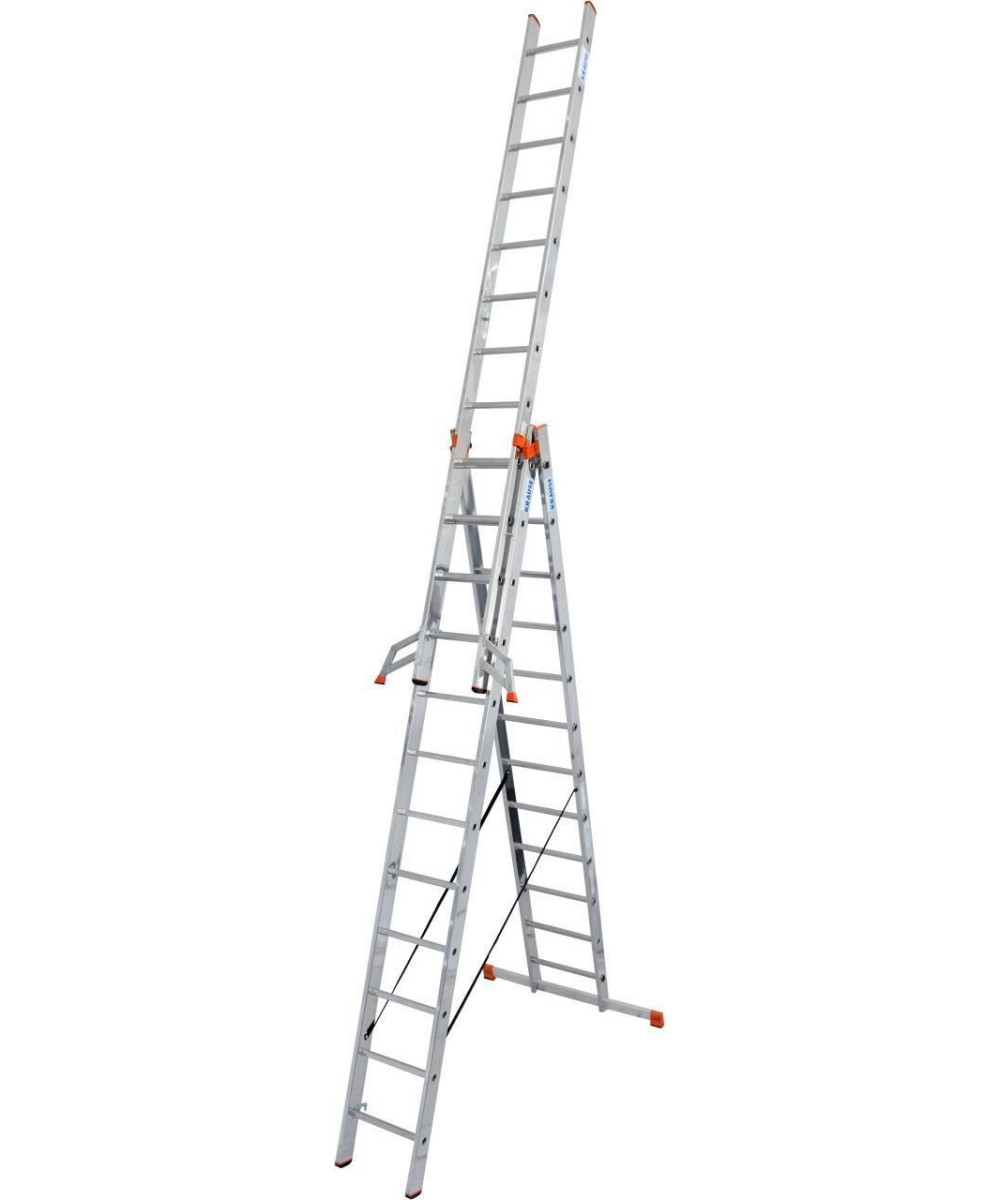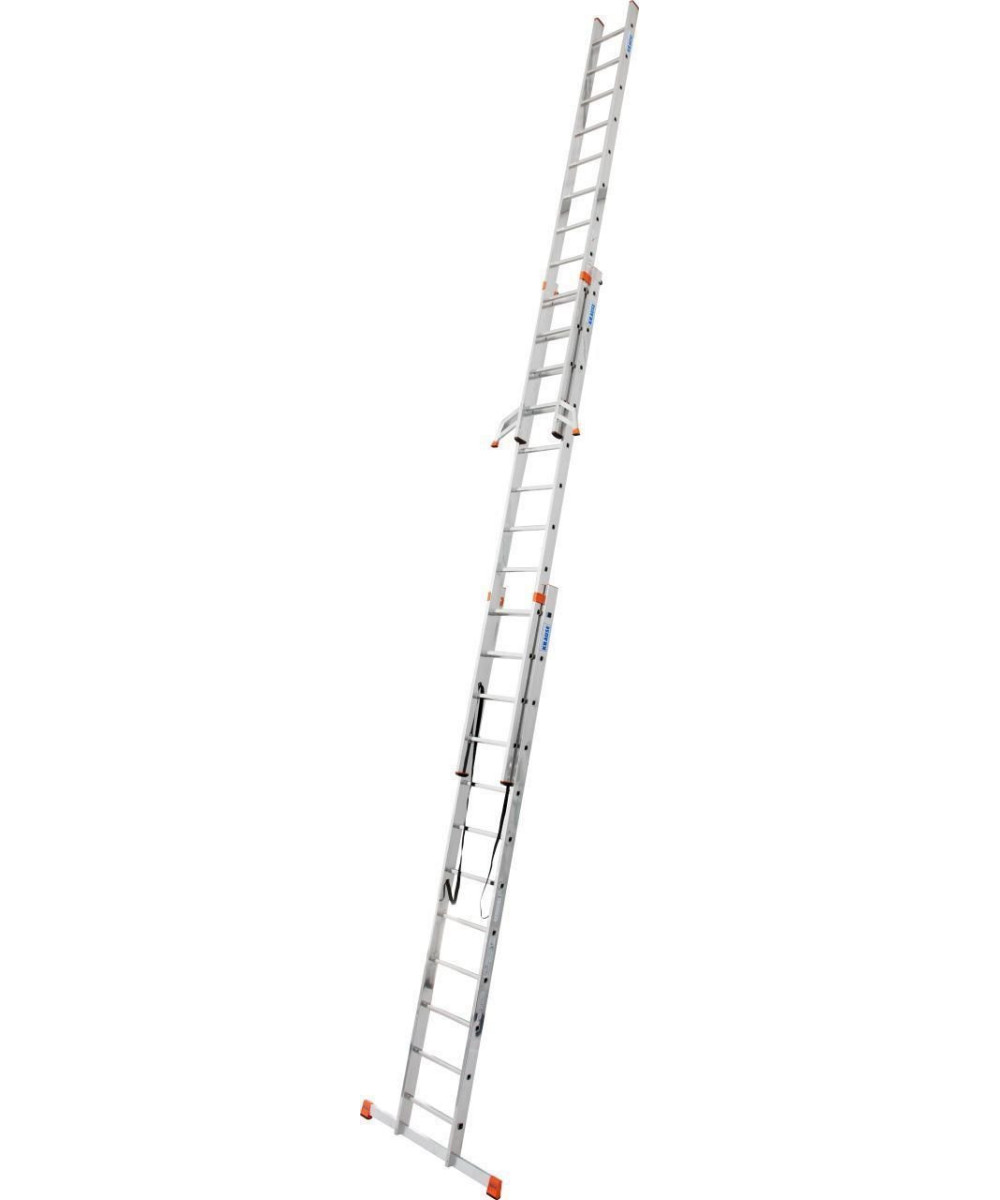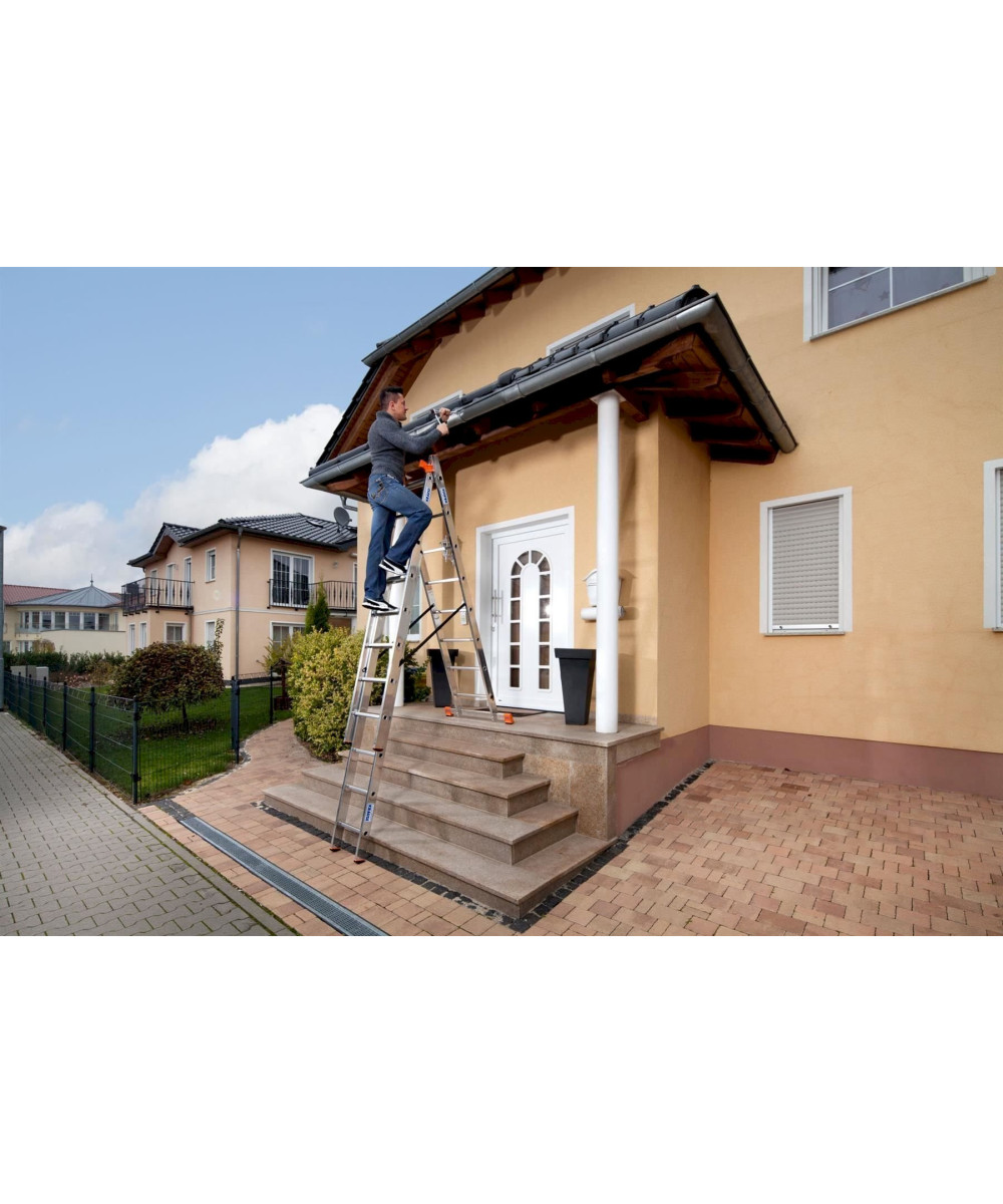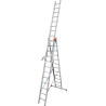 Dreiteilige Aluminium-Vielzweckleiter, einsetzbar als Anlege-, Schiebe- und Stehleiter mit ausschiebbarem Leiternteil.