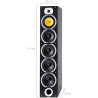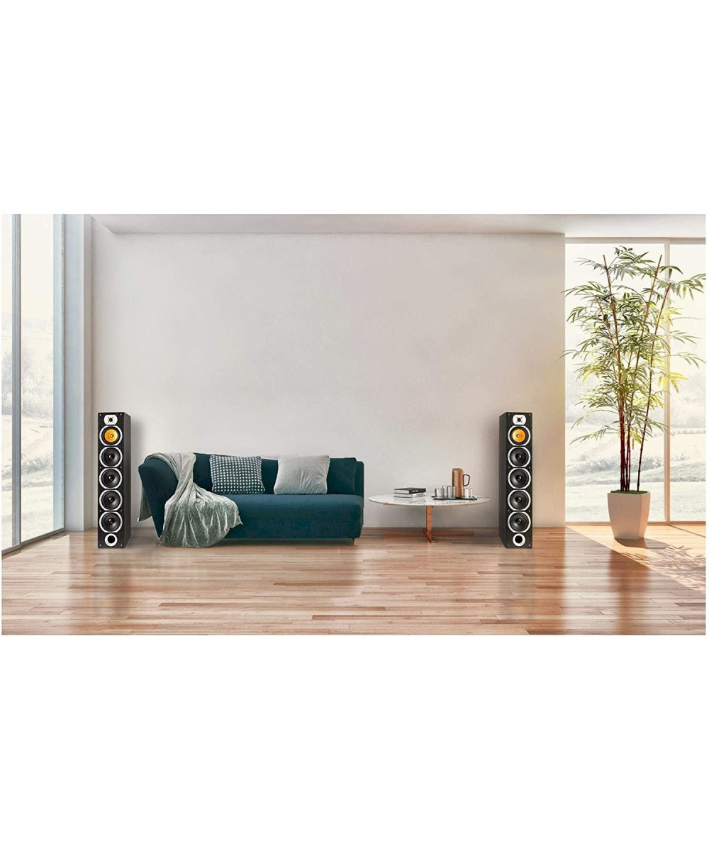 L'excellente finition de la colonne de haut-parleurs est encore relevée grâce au boîtier en bois à veinage du bass-reflex. Sa forme claire et des membranes bien renforcées convainquent l'environnement. Le cache noir est détachable et met alors en valeur les tampons jaunes. Le design décent est tout aussi bien adapté à un décor classique qu'à un habitat ultramoderne.