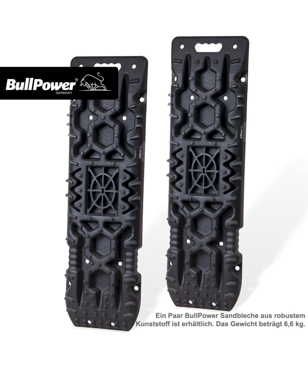 Die Marke BullPower hat sich auf Offroad-Produkte und Zubehör spezialisiert und ist für hochwertige und robuste Produkte bekannt. Die Offroad-Sandbleche von BullPower sind aus robustem Kunststoff gefertigt, was sie leichter und einfacher zu transportieren als vergleichbare Sandbleche aus Aluminium oder Stahl macht. Ein Paar dieser Sandbleche hat ein Gewicht von 6,6 kg und sollte für die meisten Anwendungen geeignet sein.