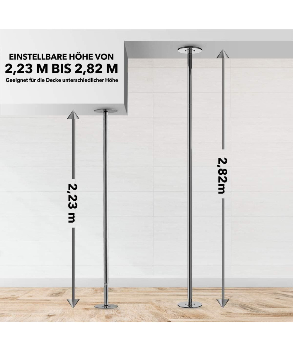 - 【Hauteur ajustable】 Grâce à son design à hauteur réglable, cette barre de danse de haute qualité peut être allongée dans une plage de 2,23 m à 2,82 m, ce qui lui permet de s'adapter à différents hauts plafonds, comme par exemple à la maison, à la salle de gym, au club et à d'autres endroits. En outre, les anneaux en silicone antidérapants aux extrémités empêchent la couverture ou le sol d'être rayés.