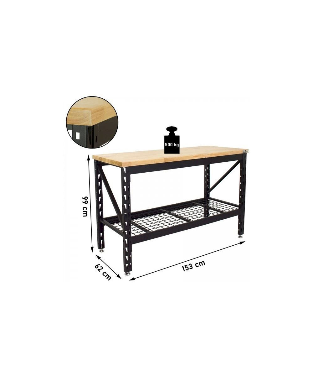 Mit einer Tragkraft von 500 kg und den Maßen 153 x 62 x 99 cm (LxBxH), bietet der Werktisch genügend Arbeitsfläche und eine sehr hohe Tragkraft, damit dieser für die meisten Arbeiten genutzt werden kann.