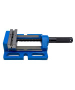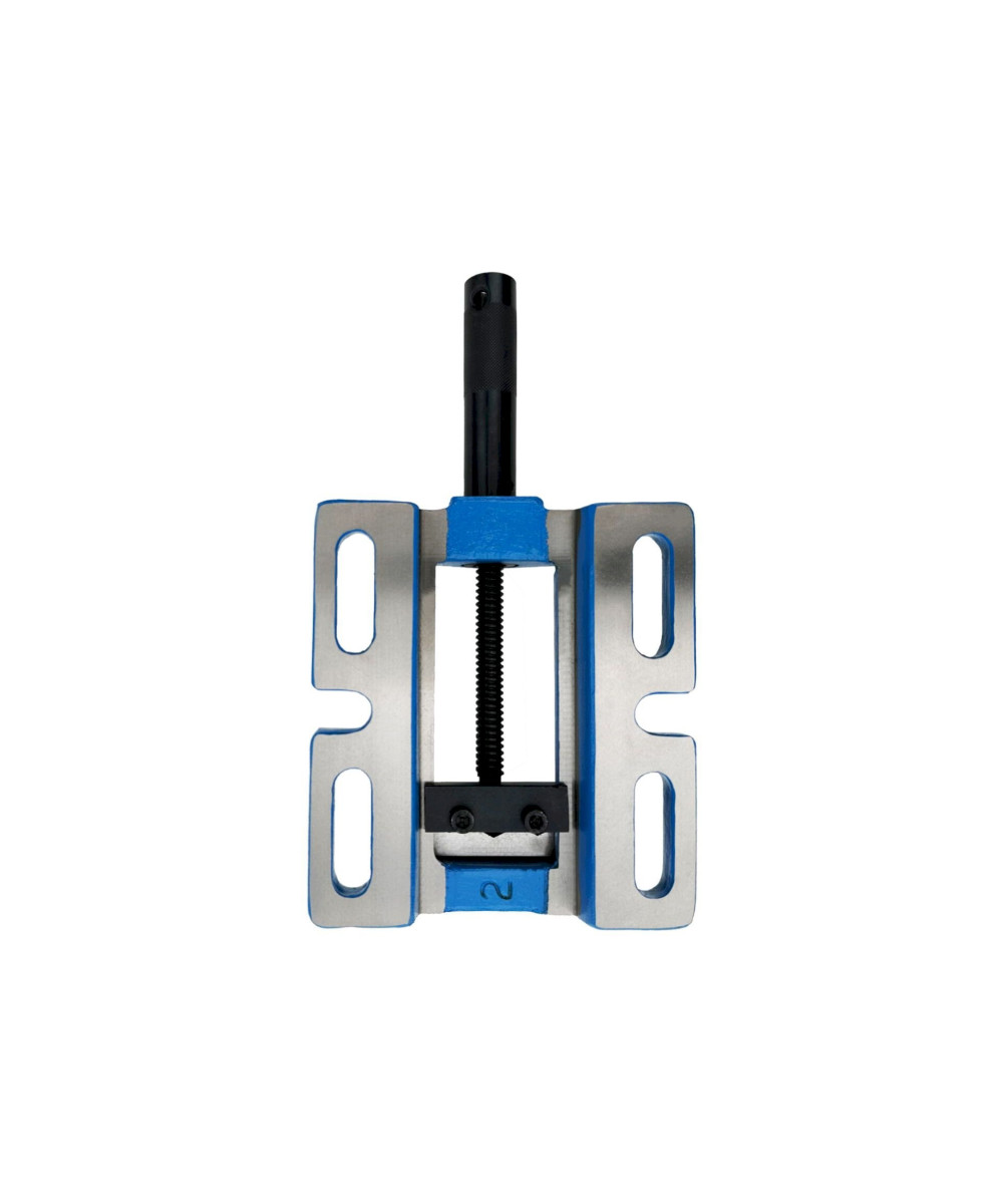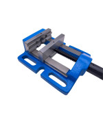 Da der Schraubstock aus solidem Gussstahl besteht, hat er ein vergleichsweise hohes Eigengewicht, was die Stabilität beim Bohrvorgang erhöht. Die Backen, von denen eine über horizontale und vertikale Prismen verfügt, sind aus Stahl gefertigt und geschliffen. Unter Verwendung der drei seitlichen Langlöcher kann der Schraubstock auf einem Maschinentisch befestigt werden.