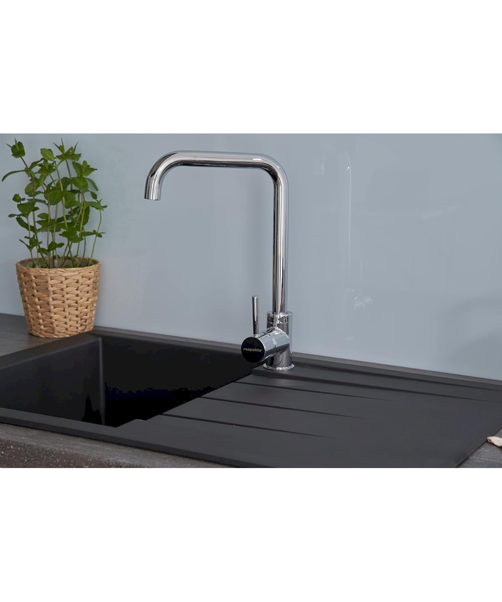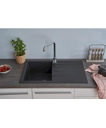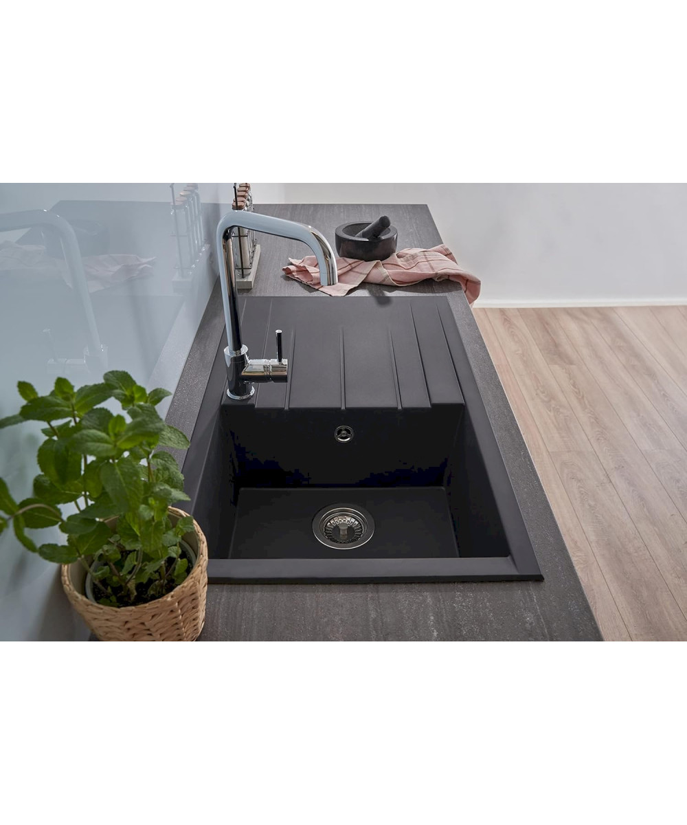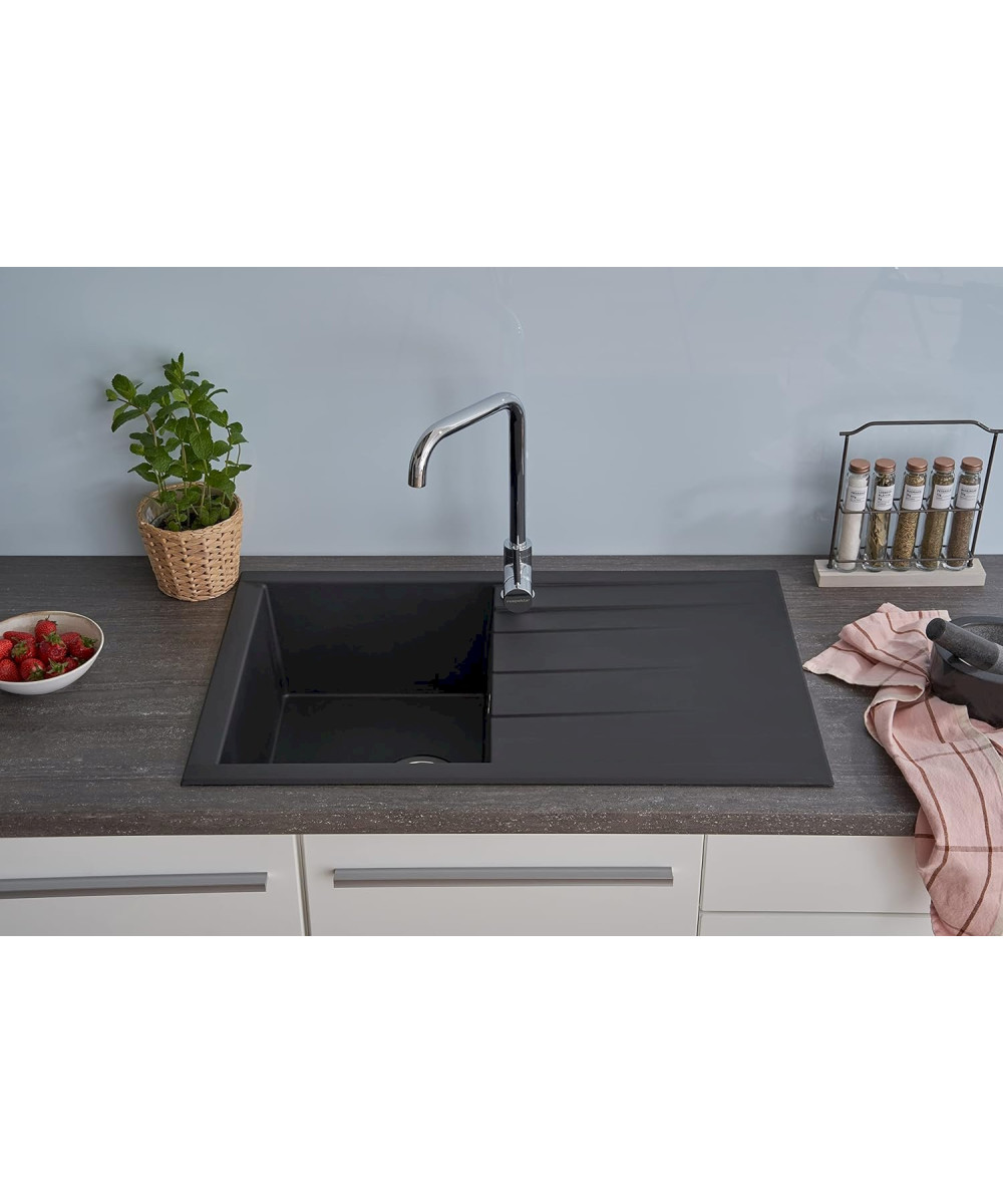 L'évier Mineralite Houston de haute qualité impressionne non seulement par son design moderne, mais aussi par sa fonctionnalité ! La surface est facile à nettoyer et résiste aux taches et aux substances chimiques. Grâce au matériau composite composé de minéraux, de fibres de verre et de résine synthétique, l'évier est extrêmement résistant, même à des températures élevées allant jusqu'à 180°, les chocs et les rayures n'ont aucun effet sur le matériau. L'évier peut être installé de manière réversible (gauche ou droite) à partir d'une largeur d'élément bas de 50 cm et constitue donc également un point fort pour votre cuisine.