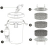 Le filtre d´aquarium est livré avec les médias filtrants pour les trois étapes de filtration. Les paniers de filtre à poignées pratiques, peuvent être remplis individuellement avec le matériau filtrant. Placez les matériaux filtrants en commençant en bas par les plus grossiers et en terminant en haut par les plus fins. La première étape de filtration placée en haut, nommée le préfiltre, retient efficacement les saletés grossières et prolonge de maniéré considérable la durée de vie utile du matériau de filtration à action biologique située dans les étapes de filtration au-dessous. Le préfiltre peut être facilement retiré et est facile à nettoyer.
