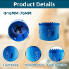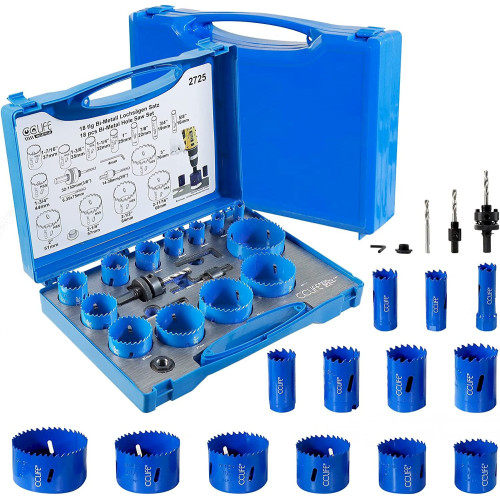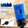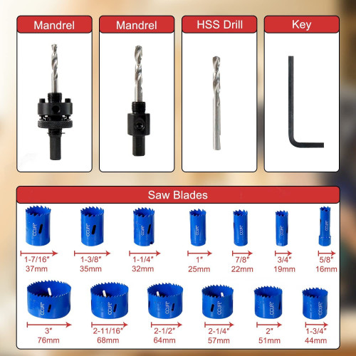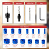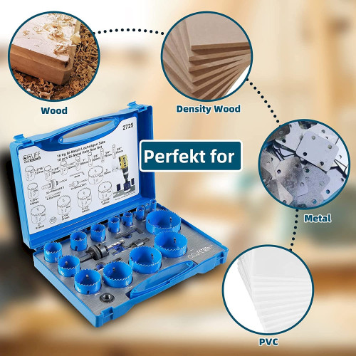 13x Lochsägen mit Durchmesser: Ø 16-19-22-25-32-35-37-44-51-57-64-68-76 mm, 2x Aufnameschäfte mit 11mm (7/16") und 9,5mm Antrieb (3/8"), 1x Adapter. Schnitttiefe: 38MM