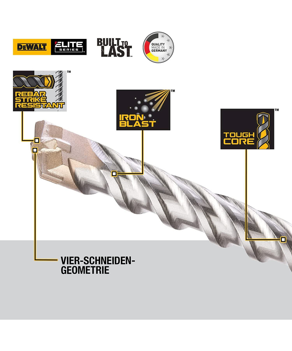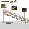 - Pointe en carbure monobloc avec quatre faces de coupe pour éviter le blocage dans les barres d'armature, ce qui permet également d'obtenir des trous plus nets et plus concentriques et une vitesse de perçage élevée et constante