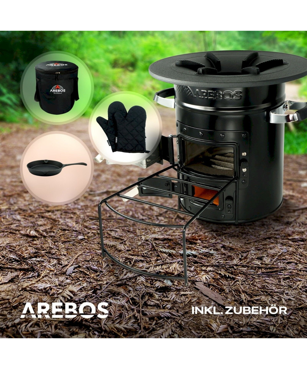 Le poêle-fusée d'AREBOS offre de nombreuses possibilités d'utilisation. Vous pouvez l'utiliser sur votre terrasse, dans votre jardin ou bien sûr en camping comme foyer extérieur sûr, flexible et efficace. Mais notre barbecue est également un fidèle compagnon en tant que source de chaleur et de lumière en cas de panne de courant.