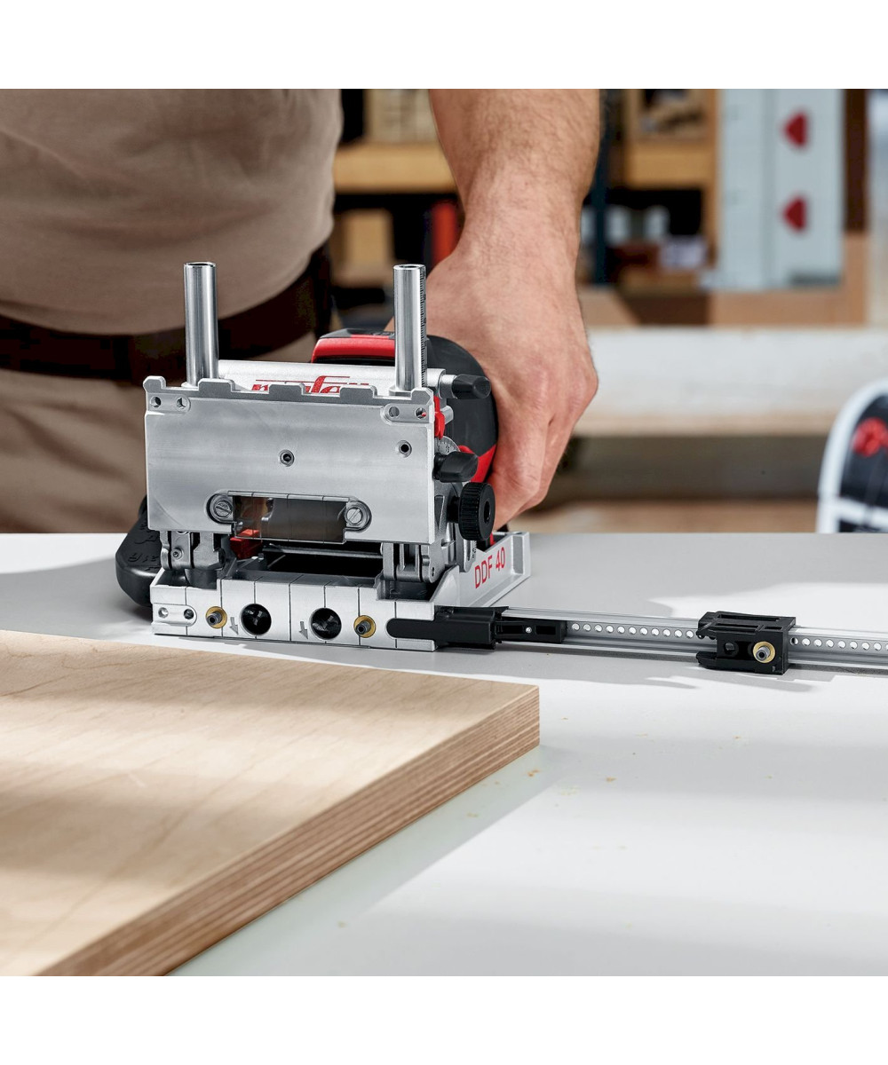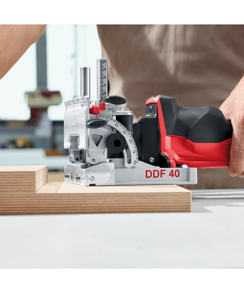 - La DDF 40 a une nouvelle forme grâce à sa plaque de base plane: Elle allie ainsi la manipulation aisée d’une fraiseuse à lamelles aux nombreux avantagesd’un assemblage par tourillons.
