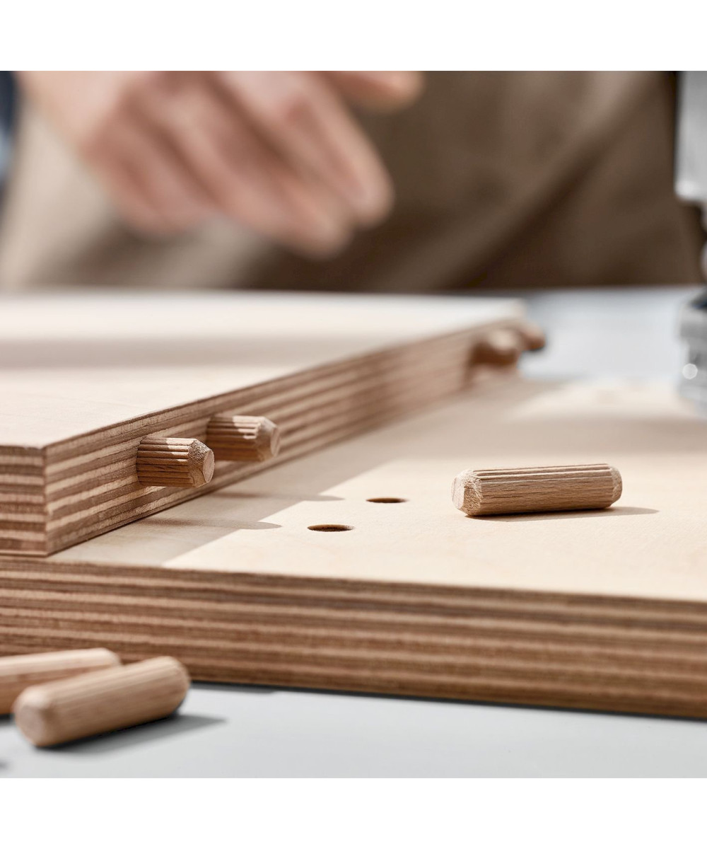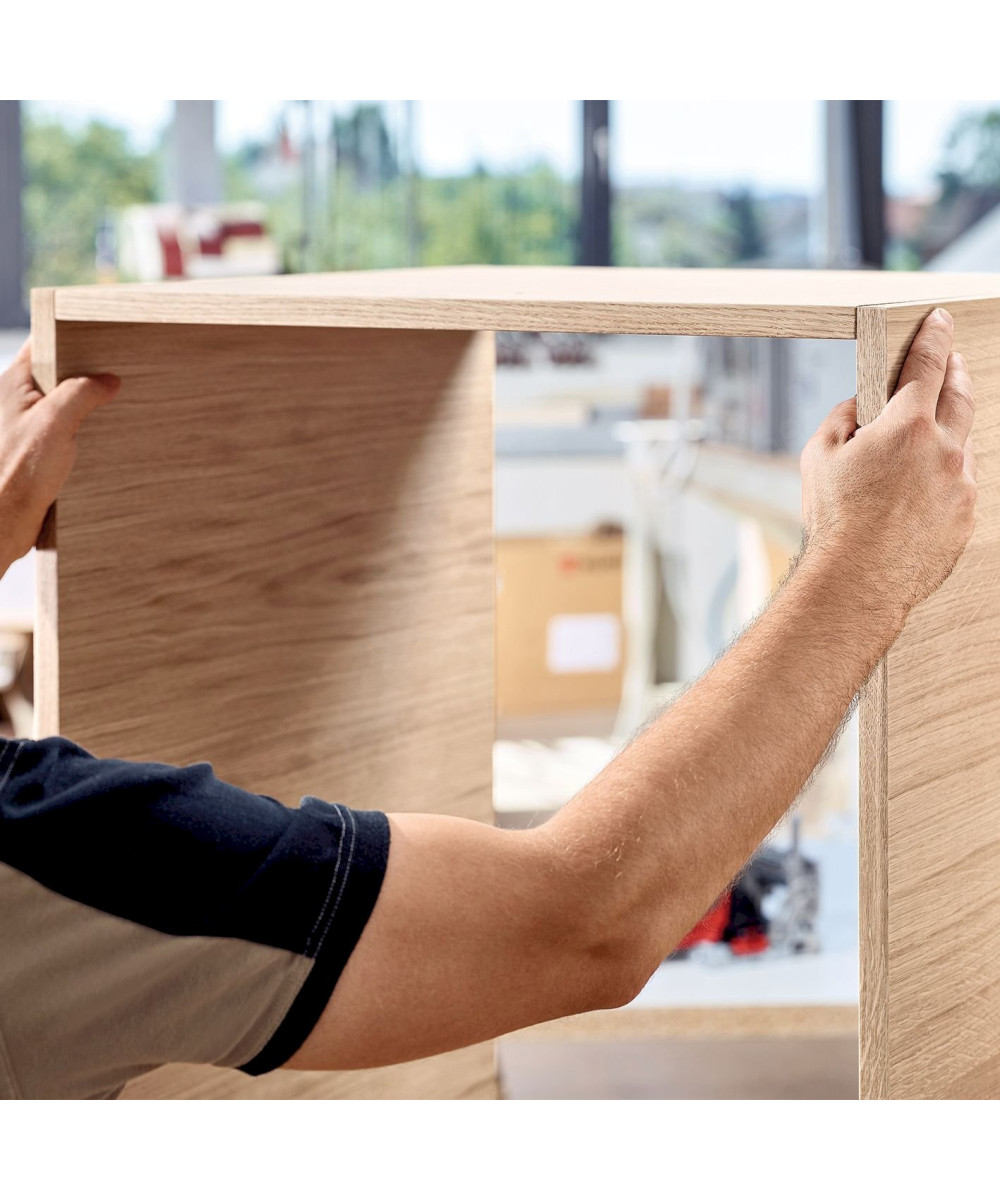 Coin extérieur, paroi centrale ou rangée de trous : la DDF 40 ne fournit pas seulement la précision d’une machine stationnaire, elle s’avère être également particulièrement économique, utilisant des tourillons en bois ronds standards.