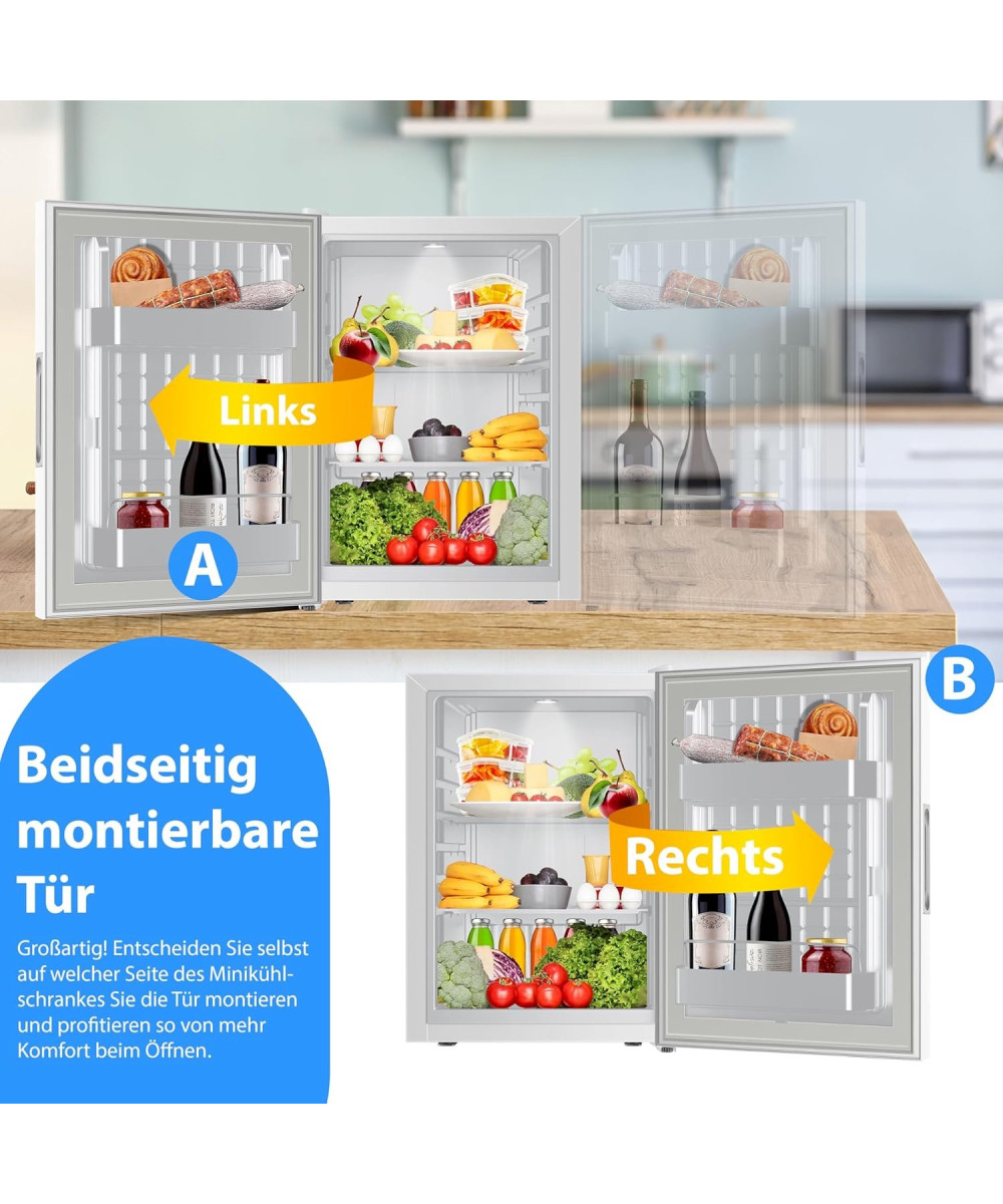 Une autre fonction assure un haut niveau de flexibilité. Grâce à la porte à montage des deux côtés, vous êtes totalement libre où vous voulez positionner le réfrigérateur. Ainsi, il n'y a pas de complications et aucune ouverture compliquée du réfrigérateur compact de 40 l. L'éclairage LED de haute qualité assure une vision claire après l'ouverture du congélateur mobile, ce qui vous permet d'avoir la meilleure vue d'ensemble de vos aliments. - Car l'œil mange avec vous