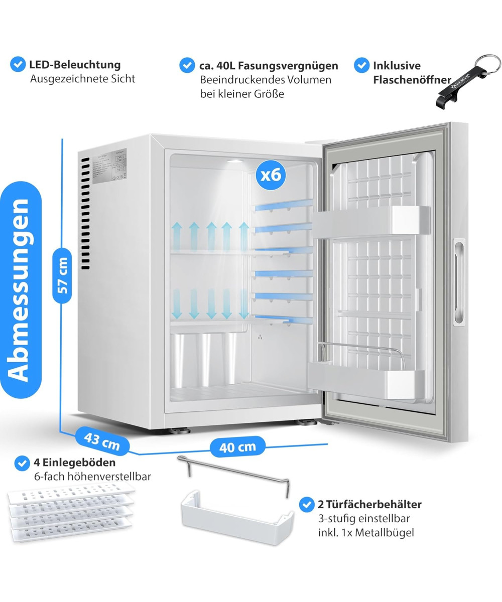 En plus du volume impressionnant avec cette taille d'environ 40 l, vous avez vraiment assez d'espace pour le champagne, le vin, les cocktails, la bière, les boissons douces ou énergétiques et les collations fraîches. Ainsi, vous êtes prêt pour une soirée entre filles ou hommes et vous pouvez profiter de la soirée avec vos proches. Grâce à sa taille compacte, le réfrigérateur de table peut également être rangé facilement et ne s'oppose donc pas.